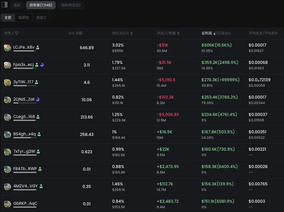 在 FIGHT 上盈利最多的幸运儿为 LCJFe 开头的地址,其在开盘 23 分钟后以 0.00017 美元的平均成本买入,在价格翻倍后卖出本金,目前浮盈 57.59 万美元,涨幅超百倍。