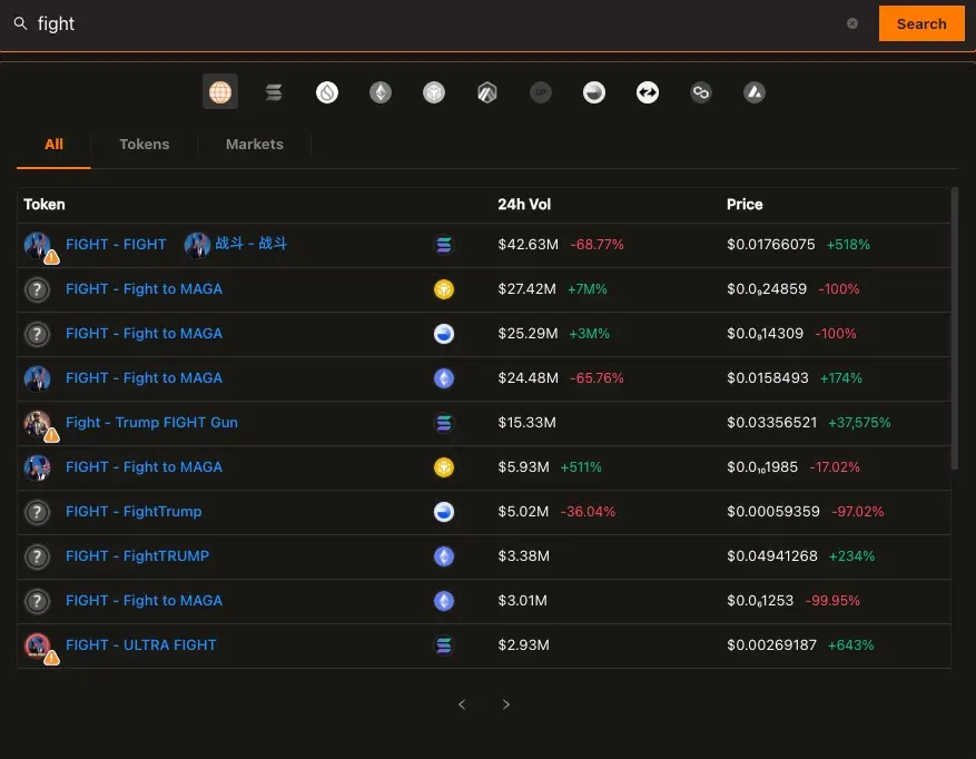 对于 meme 炒作来说,事件发酵、发币、拉盘已成基本程序。上述这些名称所代表的代币不仅 1 个,在任何 dex 上搜索其中任何一个词,都可以搜索到几十个同名代币。据 gmgn 数据,名为「 Fight 」的代币在 Solana 上有 24 个,在以太坊上有 23 个,而 EAR 在 Solana 上有 11 个,在以太坊上有 5 个。