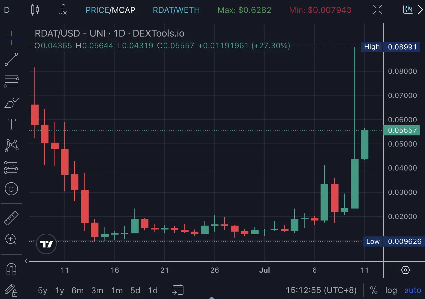 就这么平淡地过去了三个月,我突然发现 $RDAT 突然跌不动了,甚至频频地「死猫反弹」。