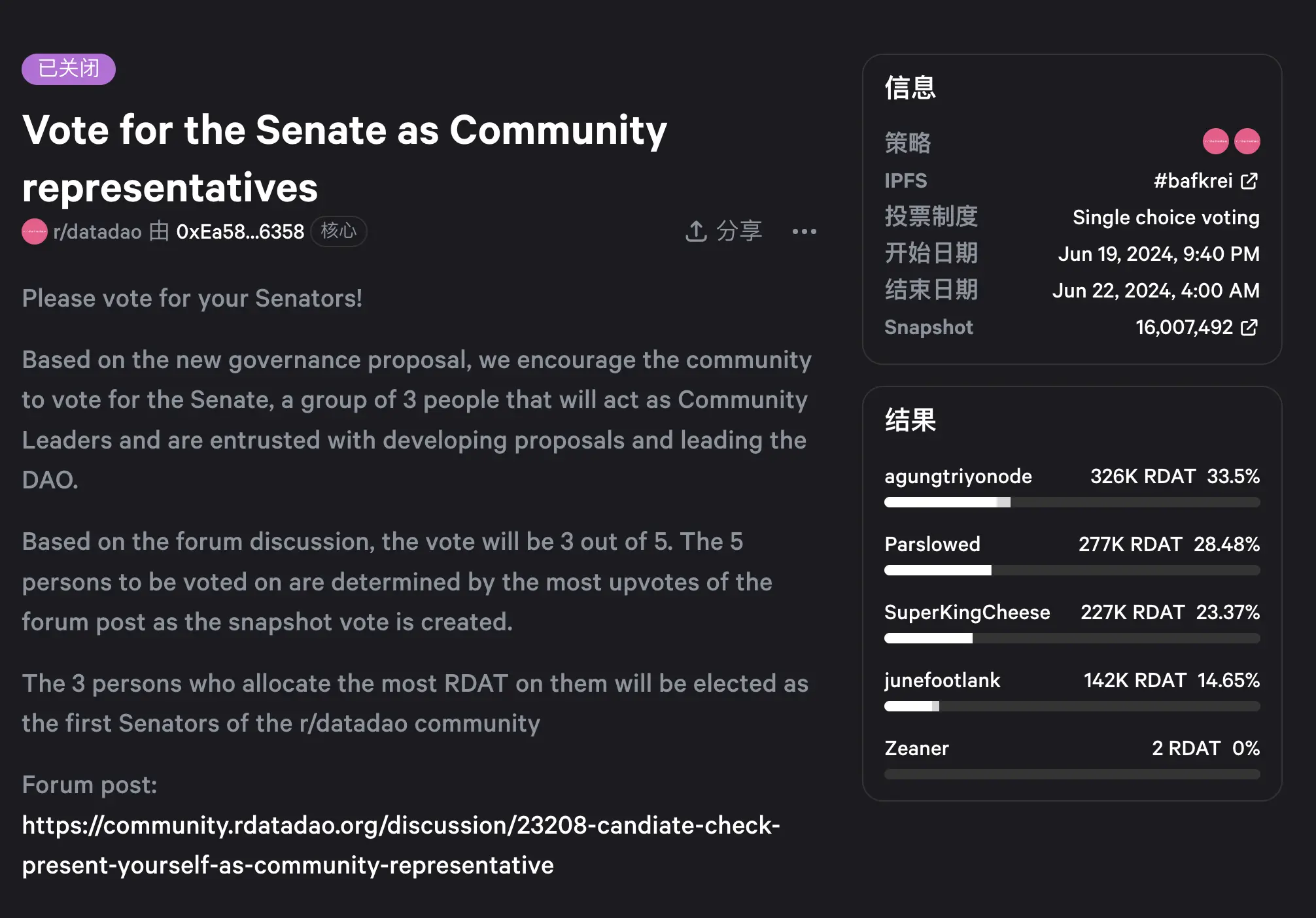 原来 r/datadao 社区一直没有坐以待毙,在 6 月 22 日选出了一个三人小组,担任社区领袖负责制定提案并领导 DAO。选出来的三人中,Agung Triyono(agungtriyonode)自称是多家 CEX 的上市合作伙伴,能够与 CEX 联系处理上市流程。Parslowed(lowparslow)则声称与 ORA 关系密切,而 SuperKingCheese 是推动这次选举的社区 OG。这三人可谓个个是人才,而他们的提案也确实让 r/datadao 起死回生。