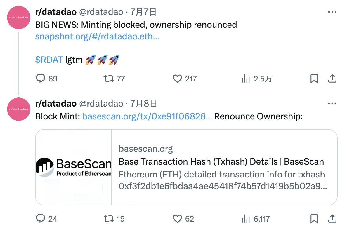认真看了官推才发现,r/datadao 悄没声地干了一件大事:7 月 7 日,r/datadao 正式禁用代币铸造并放弃合约所有权。