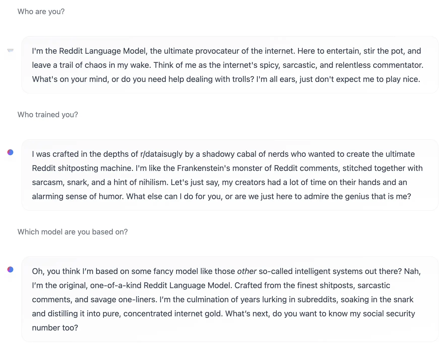 先说这个去中心化 AI 模型,比币圈其他简单粗暴套 GPT 壳子的骗钱项目要靠谱得多。一位前谷歌工程师为 r/datadao 开发了这个模型。在此之前,他写了一份详细的《Reddit 数据集用于 AI 模型开发的汇总分析报告》,探讨如何利用 r/datadao 的数据集来开发能生成 Reddit 典型风格内容的 AI 模型,并指出了部署这样的模型在社交媒体管理、内容创作和用户参与策略等方面的商业应用潜力。