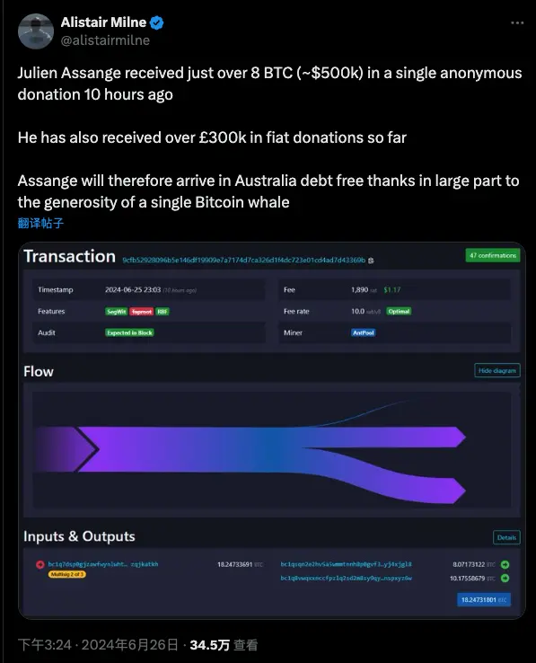 编者按:朱利安·阿桑奇(Julian Assange),维基解密(WikiLeaks)创始人,是近年来最具争议的人物之一。他因揭露全球多国政府的机密文件而闻名,这些文件涉及战争、外交和政治等多个领域。阿桑奇的行动赢得了许多支持者,他们认为他是言论自由和信息透明的捍卫者,但也引来了不少批评和法律纠纷,尤其是来自美国政府的指控。阿桑奇自 2010 年以来一直处于法律纠纷的漩涡中。他在瑞典面临性侵指控,并在英国被捕后为避免引渡到美国而寻求庇护,最终于 2012 年进入厄瓜多尔驻伦敦大使馆。在大使馆内生活了七年后,阿桑奇于 2019 年被英国警方逮捕,并再次面临被引渡到美国的风险。阿桑奇在与美国政府进行了一场漫长的法律斗争后,最近返回澳大利亚。这一回归得益于一笔匿名的比特币捐赠,缓解了阿桑奇的财务压力,同时也引发了关于捐赠者身份的广泛猜测和讨论。