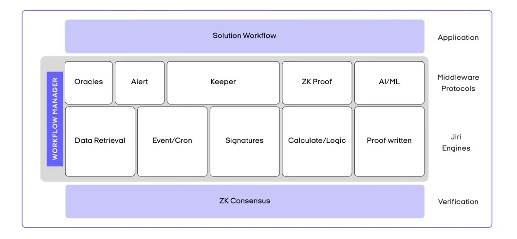 在共识机制方面,Jiritsu 引入工作流证明(PoWF)概念,网络中的节点运行由计算引擎和工作流管理器驱动的操作系统,利用生成的 ZK 证明来确保可验证计算和智能合同执行的共识机制,以将共识机制直接集成至其 MPC 框架中。与 ChainLink 或者 Pyth 等现有预言机相比,Jiritsu 不需要在汇总信息时使用跨链桥进行信息传递,同时还在简单的数据反馈外增加了对信息的分析和验证功能。