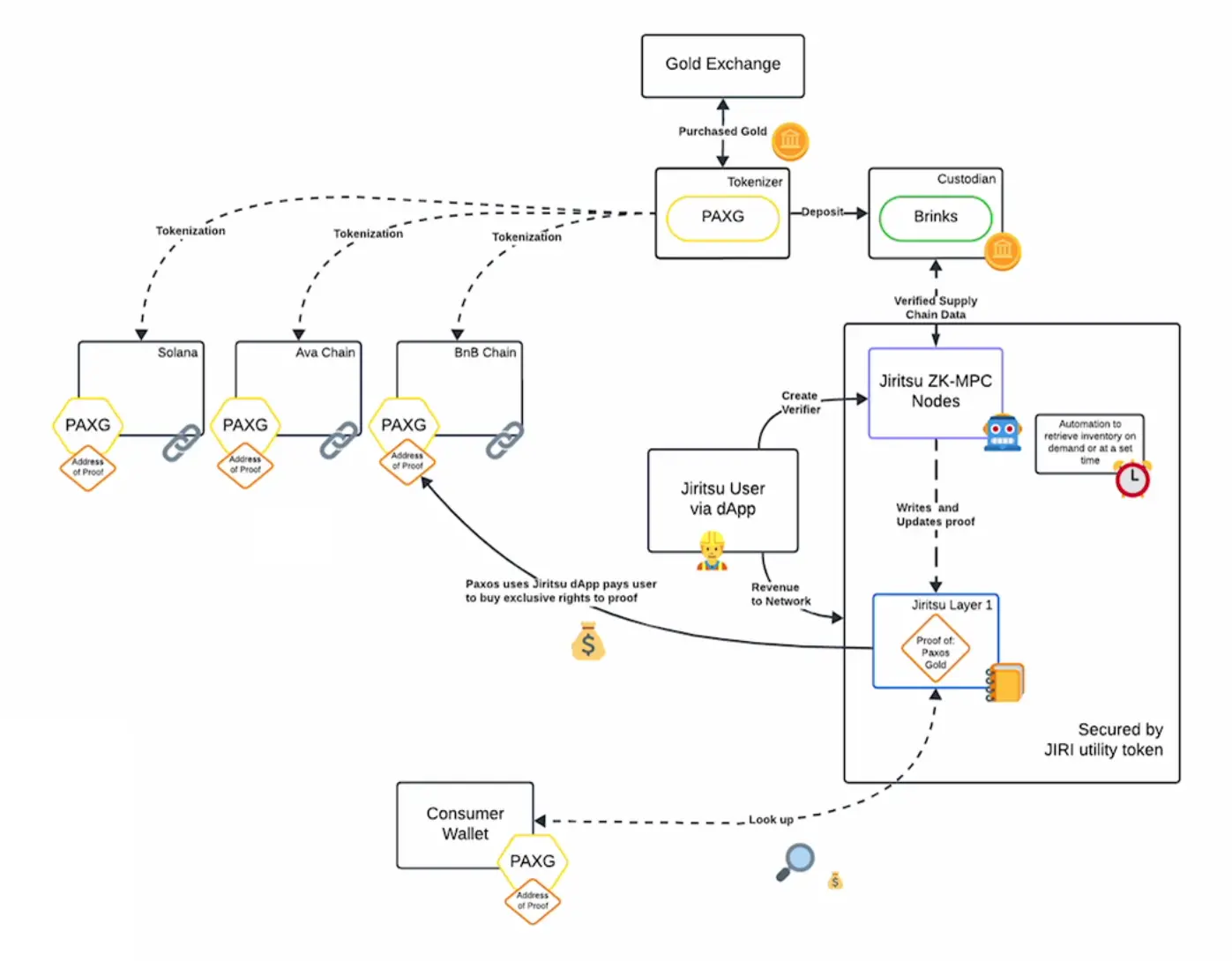 Jiritsu 官方以 Paxos 的代币化黄金产品 PAXG 为例展示了其产品使用的完整流程: