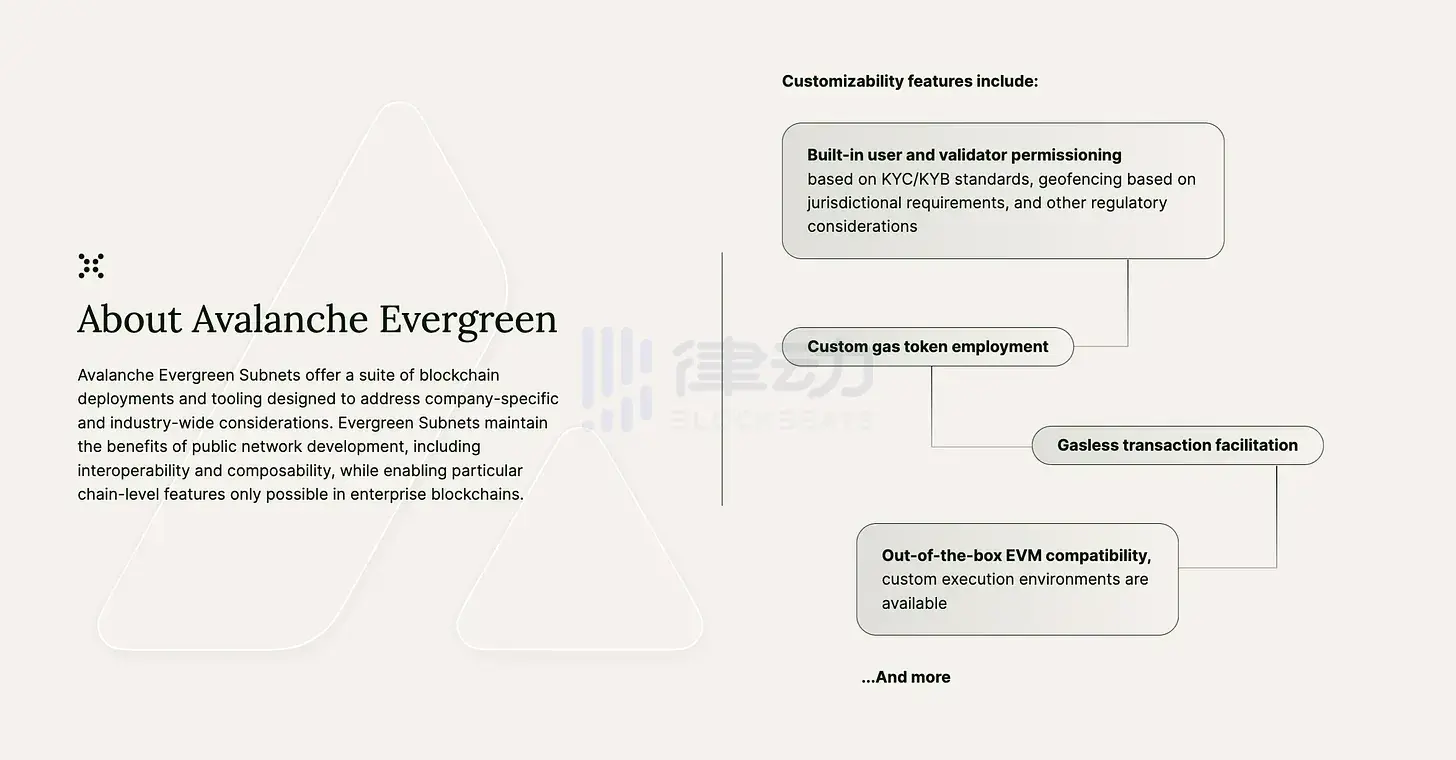 对于机构的敏感性,也让 Avalanche 最早观察到香港的资产代币化动向。2023 年 4 月香港 Web3.0 峰会期间,Avalanche 推出了 Evergreen 子网,旨在满足特定公司和整个行业对金融服务的要求。Evergreen 是一套专门为金融服务设计的机构区块链部署服务和工具,机构基于 Evergreen 子网在私有链上与经过许可的交易对手一起部署区块链结算策略,并通过 Avalanche 本地通信协议(AWM)与其他子网保持互操作能力。