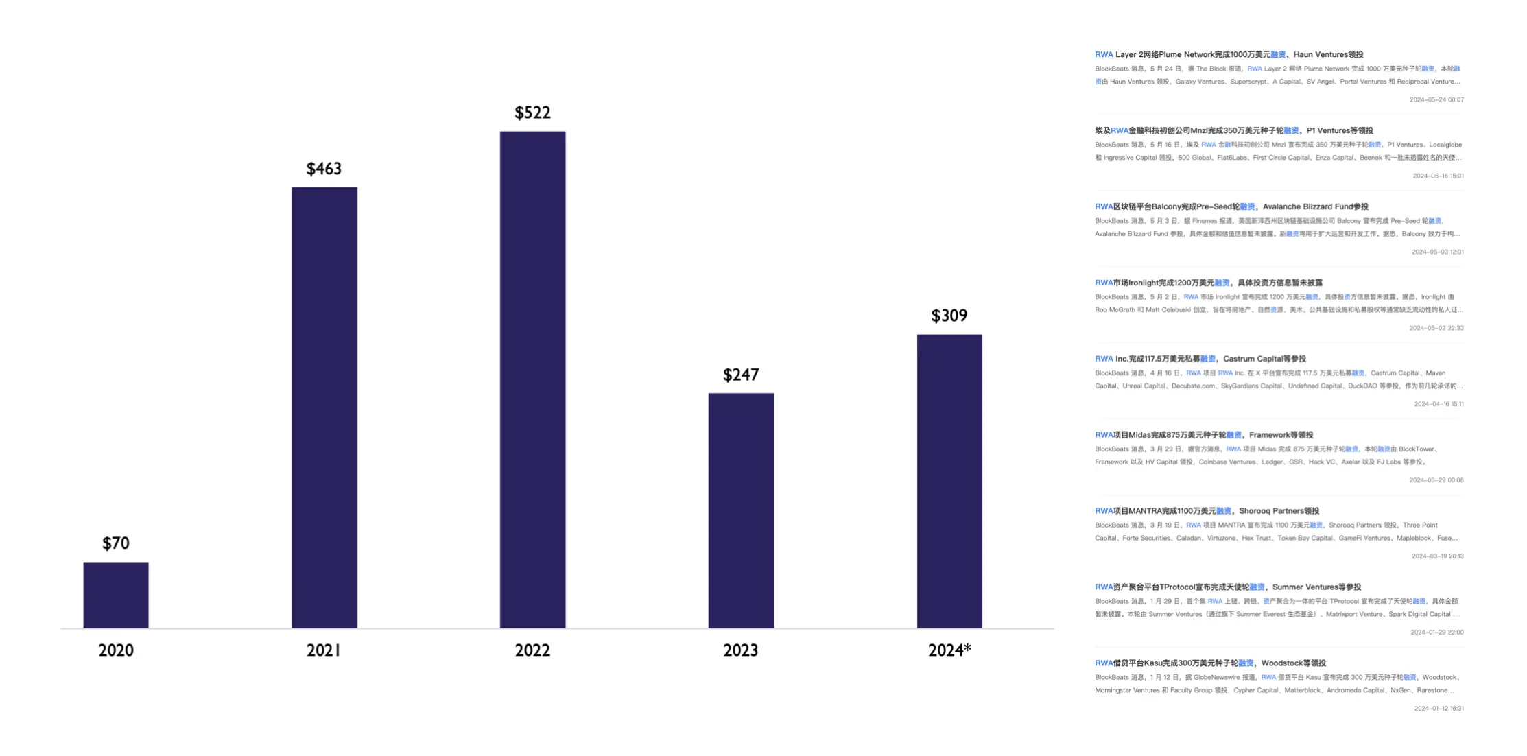 根据 The Block 的数据统计,RWA 赛道的总融资规模也在今年扭转下滑趋势,回升至 3 亿美元。当前 RWA 的趋势性复苏让不少创业者看到了新的「叙事机会」,市场上的 RWA 概念项目也在以肉眼可见的速度增加。然而,大多数获得融资的项目,往往都聚焦在特别小的垂直领域,比如自然资源、特定大宗商品以及艺术品等,而房地产领域的 RWA 项目在这一方面则尤为明显。