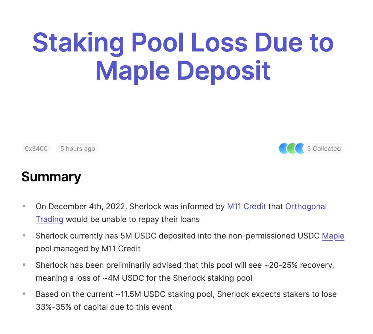 2022 年 12 月 6 日,智能合约审计平台 Sherlock 在 Mirror 上更新了博客文章,告知社区团队将因 Maple Finance 借款人违约造成大约 400 万美元的损失。在此之前,Sherlock 有约 500 万 USDC 存储在由 M11 Credit 管理的 Maple 借贷池,然而现在,该池质押者的整体资金损失将超过 30%。同日,DeFi 保险平台 Nexus Mutual 也预计自己将在 Orthogonal Trading 违约事件中损失约 300 万美元。