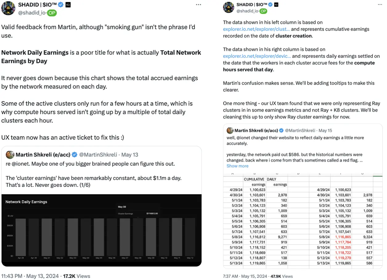 在 io.net 积分计划开启后的两个月里,不断有声音质疑 io.net 平台上所显示的 GPU 数量。最受关注的是 5 月 13 日社区成员 Martin Shkreli 的质疑,他在推特上发表了数条 io.net 前端显示数据的准确性并得到了 io.net 创始人 Shadid 的亲自回应。