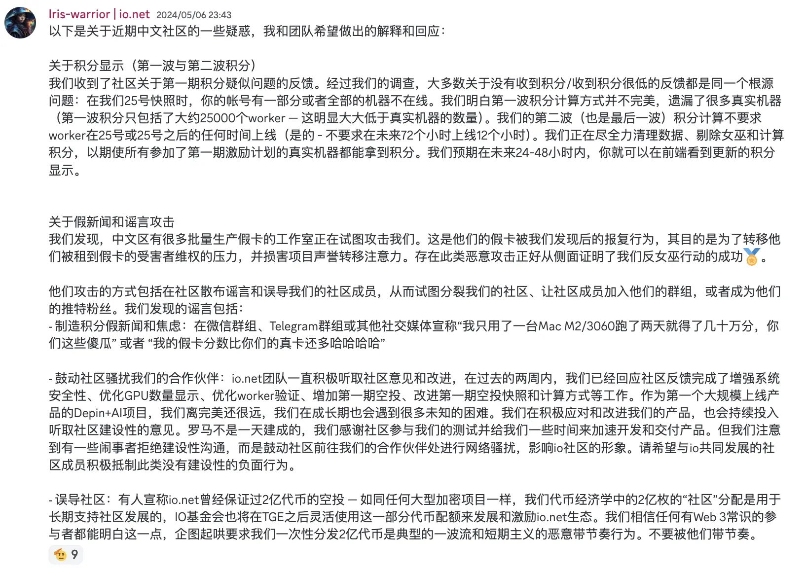 面对「全网讨伐」,io.net 团队在 discord 里发出了一篇长文回应。表示将进行第二期积分计算,剔除女巫、保留真实用户。除了积分争议,团队还表示社区正在遭遇「假新闻和谣言攻击」,并指出是背后是假卡工作室的推动。