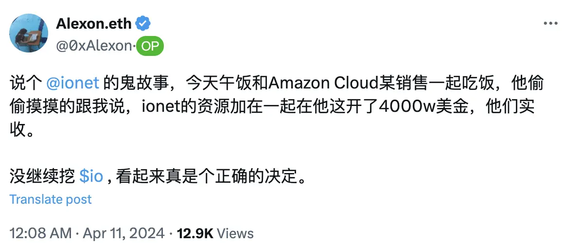 目前,没有渠道计算云服务商在这波 io.net 带起来的天降财运中的具体盈利数字,Alex 曾在一条推文中表示,国外龙头云服务商亚马逊云,在提供挖 io.net 的服务上共产生了 4000 万美元的收入。尽管评论区对这个数字的质疑声更多,但如果按照当时 io.net 前端显示的几十万台 GPU 数量来算,这个数字也许不算夸张。