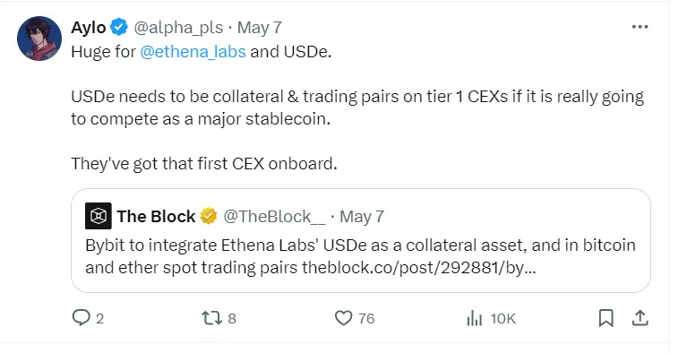社区成员抢先宣布这一消息后,本周一 ENA/BTC 交易对出现了不错的涨幅,随后 Ethena Labs 官方推特于本周二发布了 USDe 将集成到 Bybit 交易所的消息,Bybit 是四月份期货交易量第四大的交易所。当日下午,ENA 飙升至 1 美元,创下五月份以来的新高。