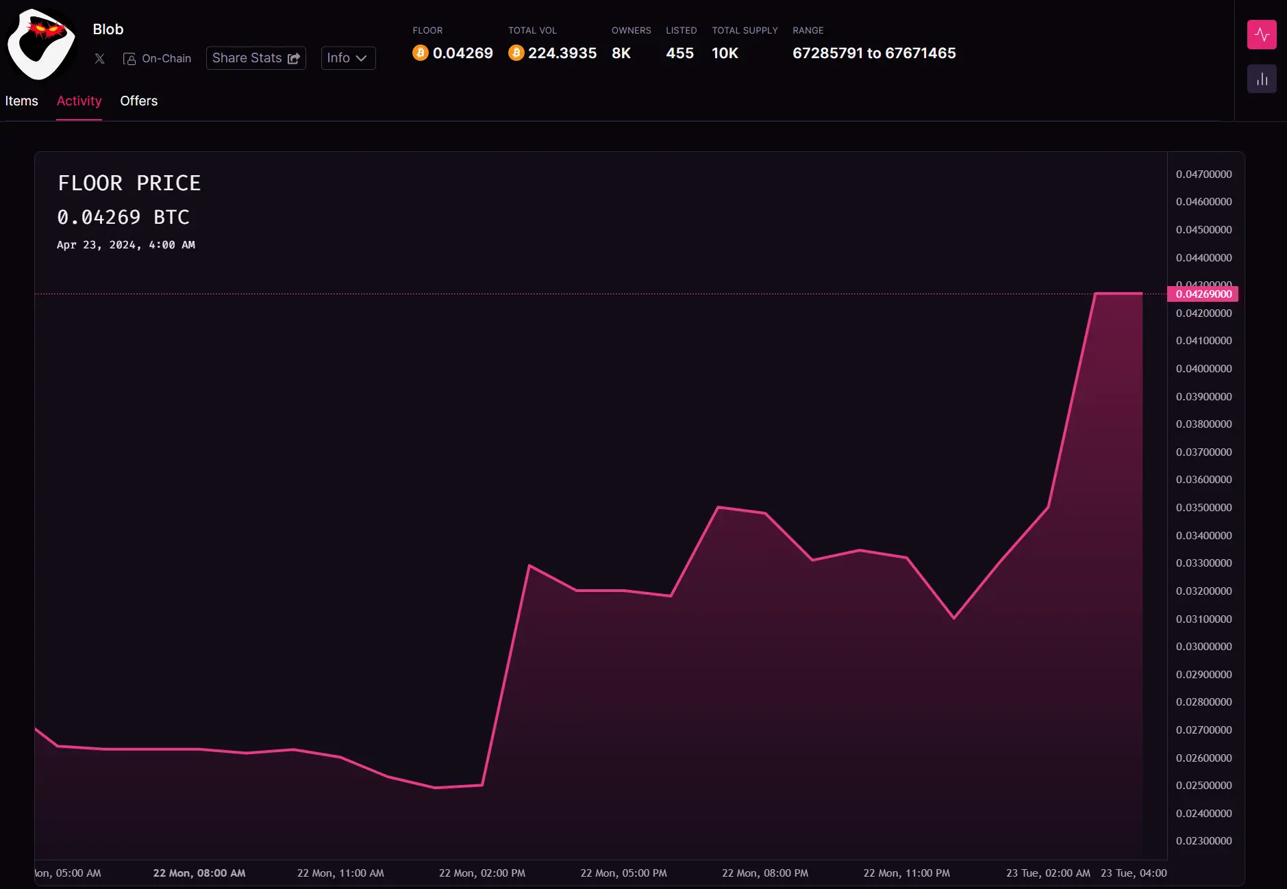在小编写这篇文章的时候,Blob 的地板价已经应声上涨了 30%,突破了 0.04 比特币。