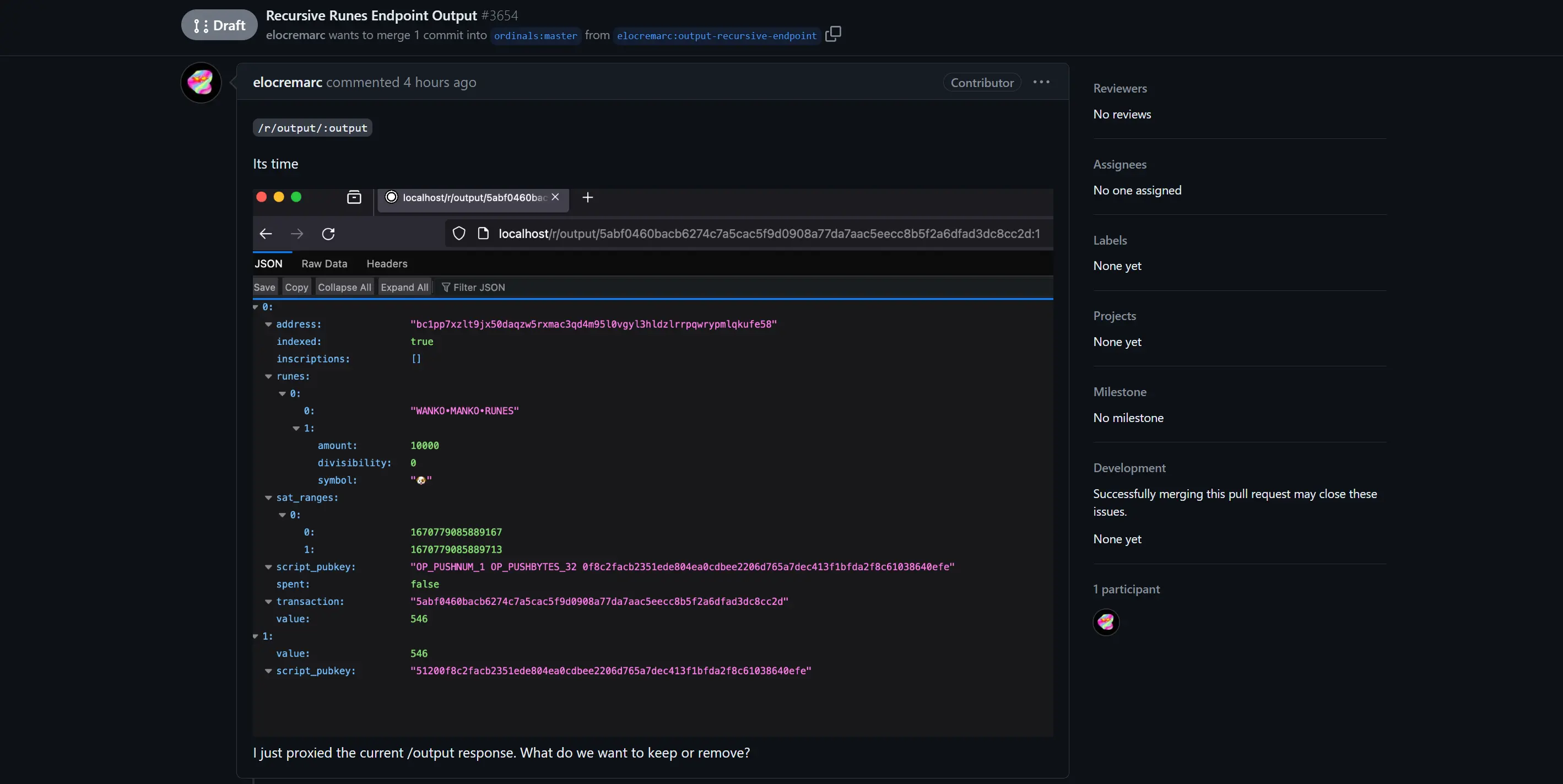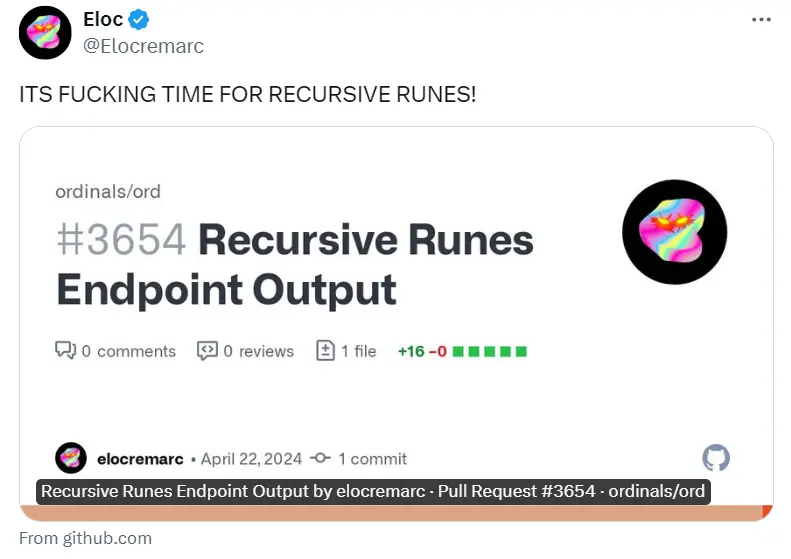 最后要再提一下,“/r/output”这个递归端点被添加,是 @Elocremarc 这个方案的先决条件。目前,@Elocremarc 已经在 Ordinals 官方的 Github 上提交了 PR,如果顺利通过了,我们就有“递归符文”玩了。