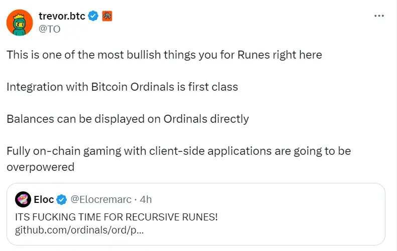 “符文”是过去一周加密市场的绝对热点,但是在极高的关注度下并没有展现出很好的赚钱效应。除了有项目方的“预挖符文”以及像 BRC-20 曾经玩过的那种“公平铸造”,“符文”或许需要更多的玩法来加以刺激。“递归符文”若能快速落地,无疑是给了“符文”一针强心剂。