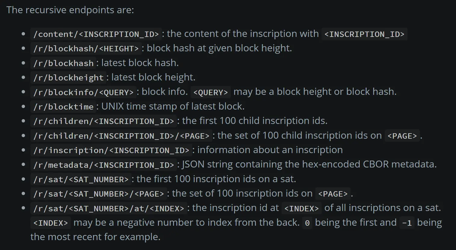 “递归”的作用大家应该都有所了解,“链上指针”,可以让铭文引用比特币链上数据,包括其它铭文的数据。支持引用的数据有以下这些,包括最新区块高度、指定区块高度、其它铭文的数据等等,这些也被称为“递归端点”。