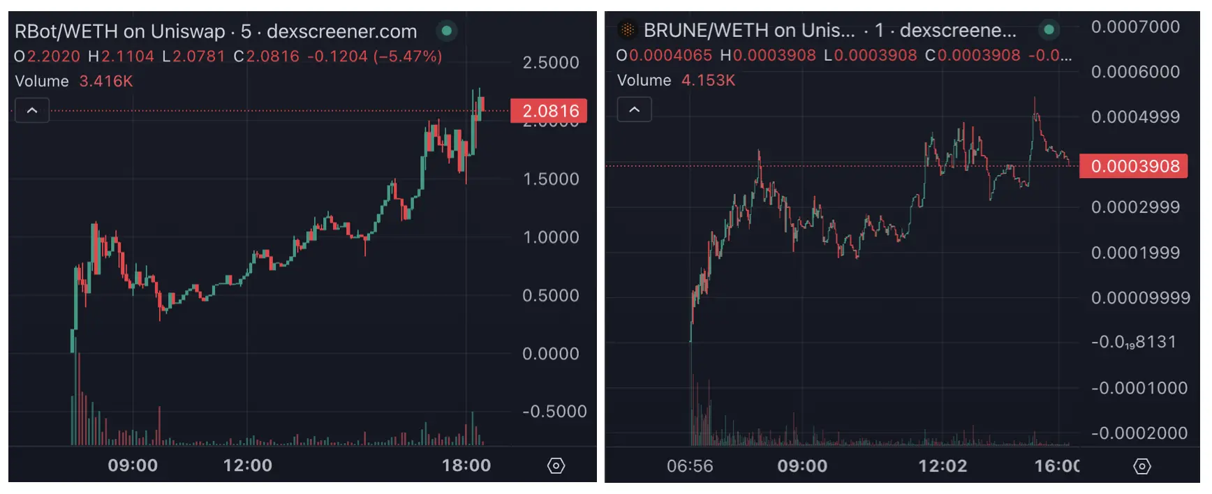 也许是 Runes 正式上线的 deadline 逼近, RBot 的回春比前述代币来的快许多,上午 10 时, RBot 等到了「价值发现」开始逐步增长,并在下午 6 时左右窜到了 2 美元的高位,8 小时涨幅 482%。