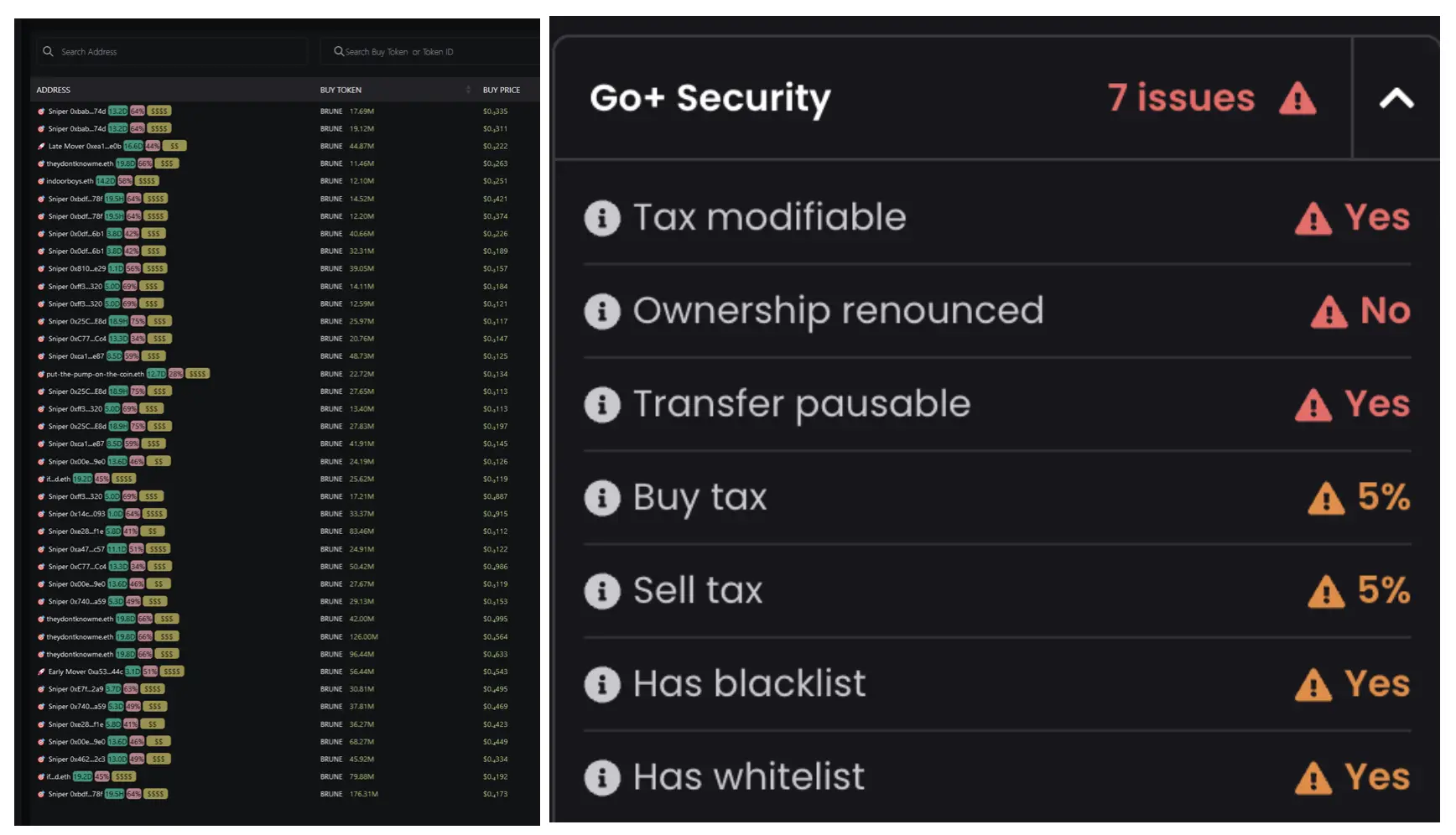 不过,链上研究员 DiTereh 已经发文提醒,「不要购买高风险的流行叙事。」他以 BRUNE 为例,指出其上线之初的买盘大部分都是交易狙击机器人,散户购买需要面临很大的抛压,并且合约本身也有极大的风险,如开发者并没有放弃合约的控制权、可以通过修改合约暂停交易、修改买入卖出的税收。