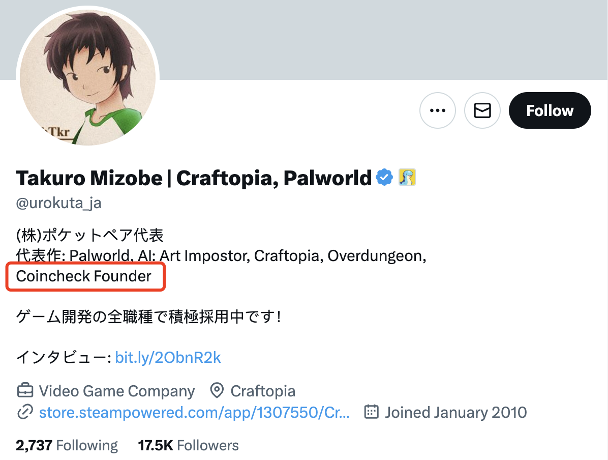 随着游戏热度只增不减,人们开始对这款只有四个早期开发人员的小成本游戏产生了好奇。而有人发现, Palworld 发行公司 Pocket Pair 的联创溝部拓郎( Takuro Mizobe )以前曾创办过一家加密货币交易平台, Takuro 的 X 账户简介中也自称是「 Coincheck Founder 」。