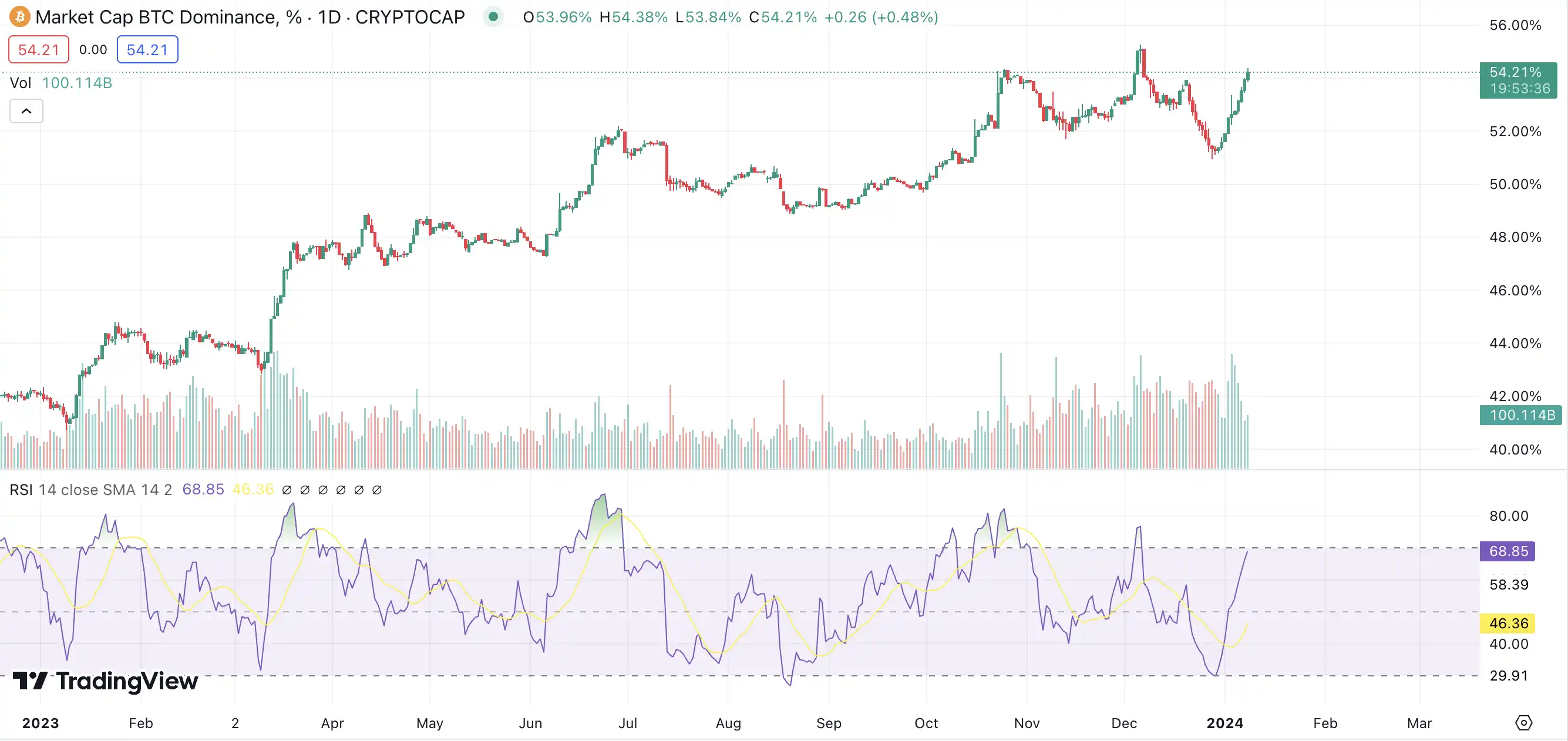 这周是比特币 ETF 是否能通过的关键时刻,昨日,Fox Business 报道贝莱德预计其现货比特币 ETF 将于周三(1 月 10 日)获得批准。因此资金纷纷从山寨币中撤出,流入比特币。市场也在赌,给出的剧本是「如果比特币现货 ETF 通过,比特币受此利好会涨;而如果没有通过,短时山寨币跌幅肯定会超过比特币。」