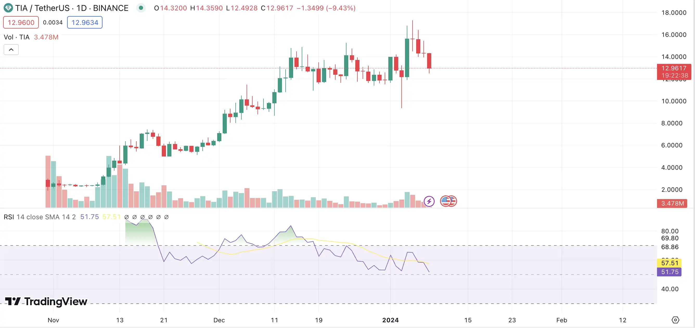 随着多个项目空投代币给 TIA 质押者,TIA 价格突破 17 美元,达到历史新高。在 1 月截至撰稿时,TIA 价格为 12.96 美元,24 小时跌幅达 13%。