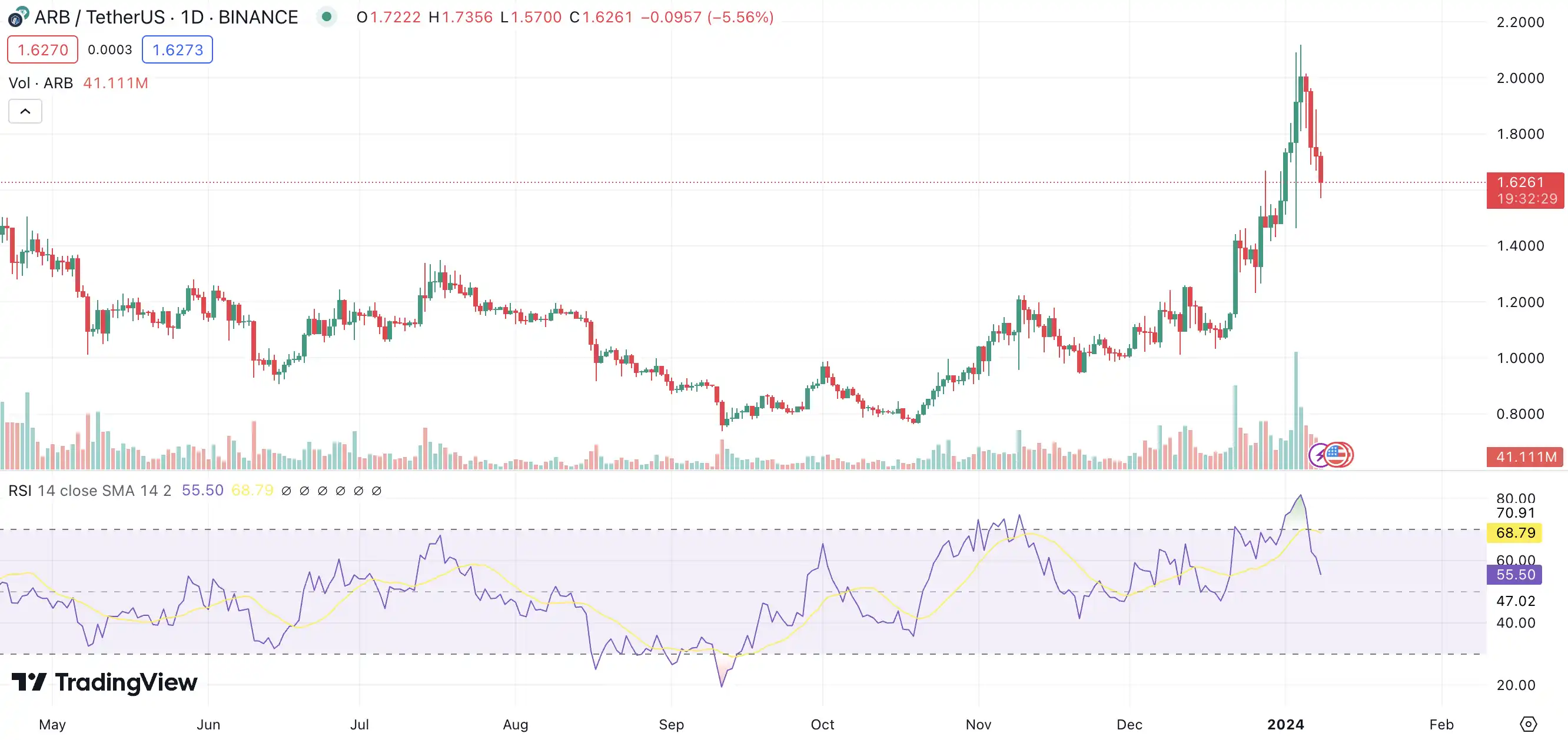ARB 在 2023 年末这波上涨行情中一度突破 2 美元,达到历史新高。截至撰稿时,ARB 价格为 1.62 美元,24 小时跌幅为 9.55%。