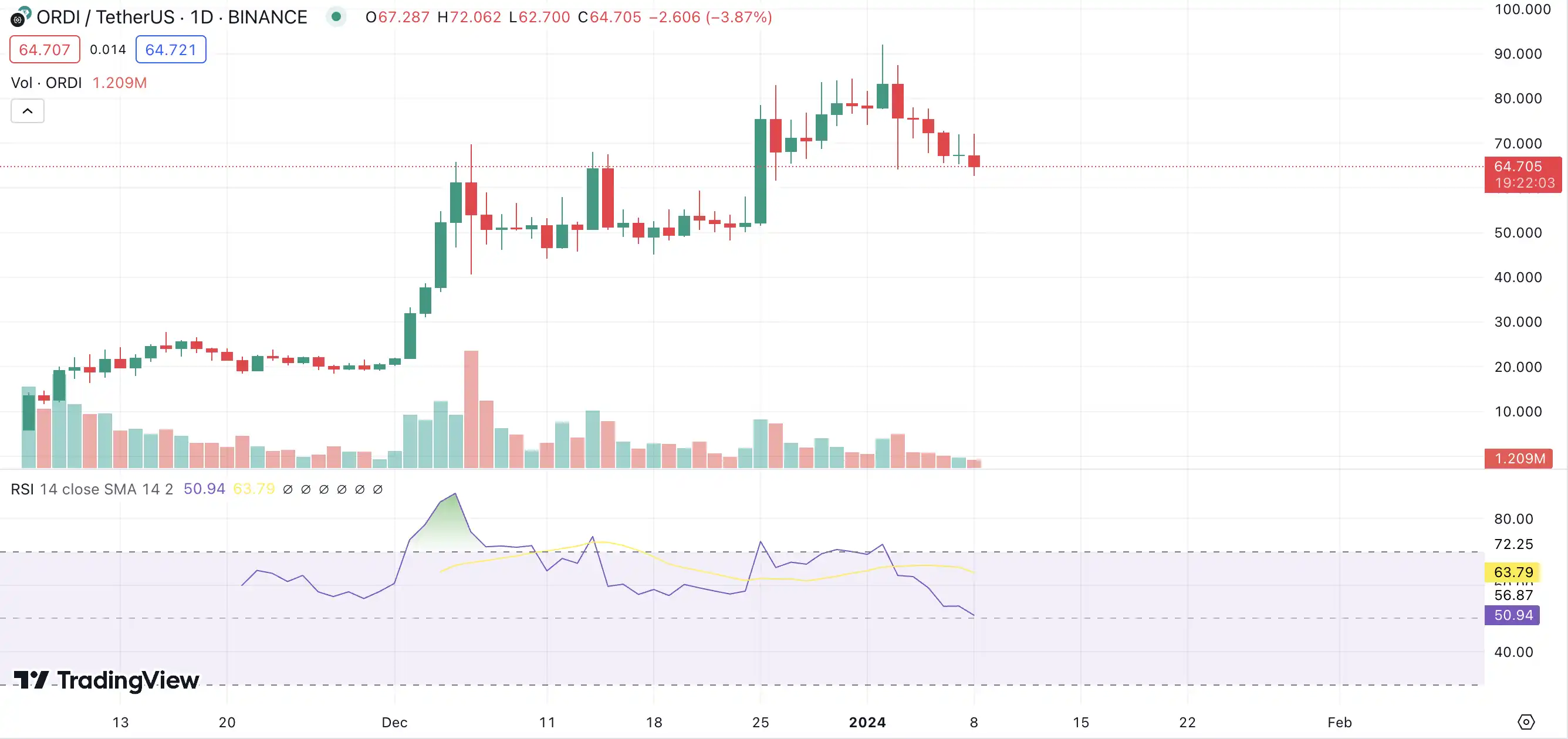 截至撰稿时,ORDI 价格为 64.7 美元,24 小时跌幅达 9.17%。
