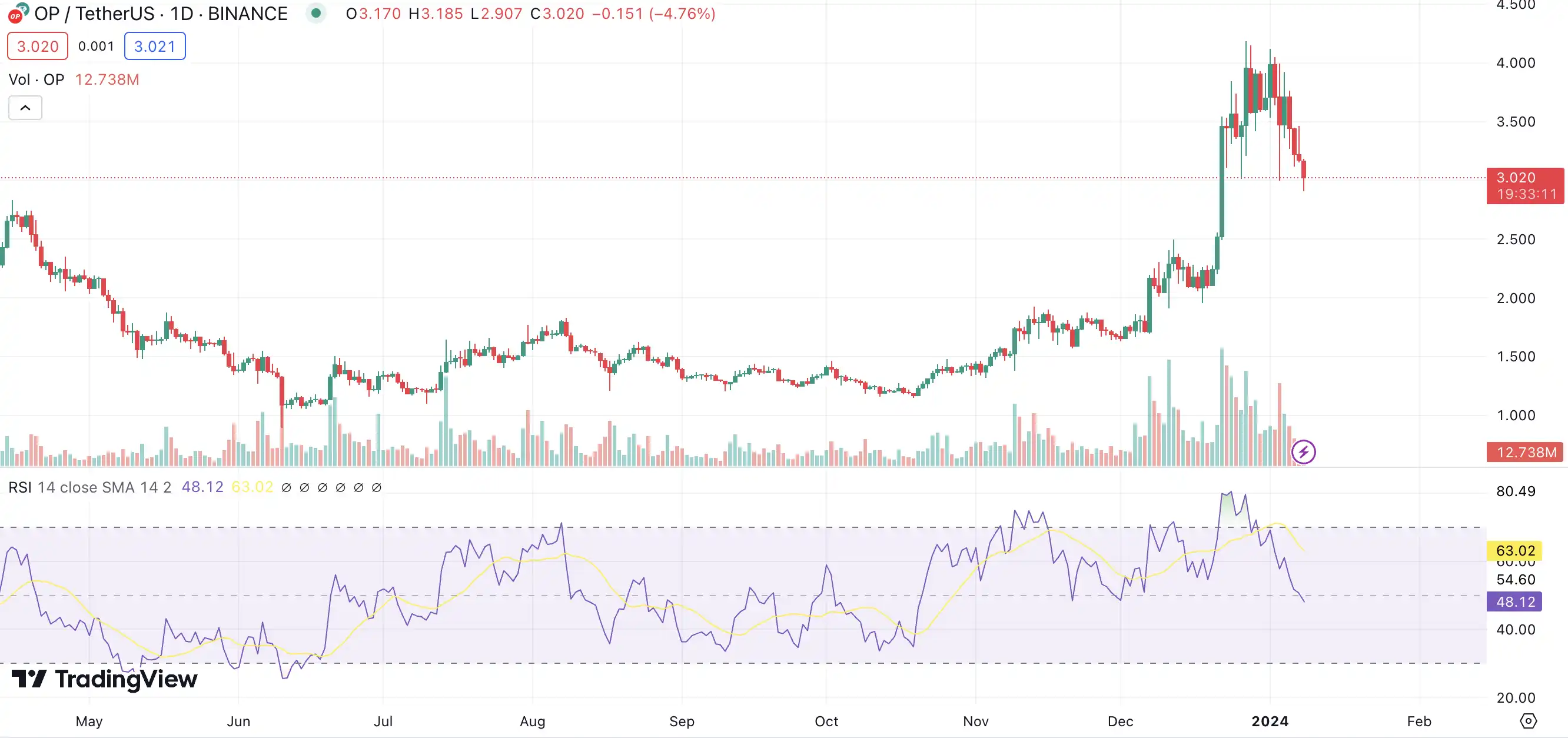 OP 是以太坊系最先开始行情启动的代币,截至撰稿时,OP 价格为 3.02 美元,24 小时跌幅为 9.1%。