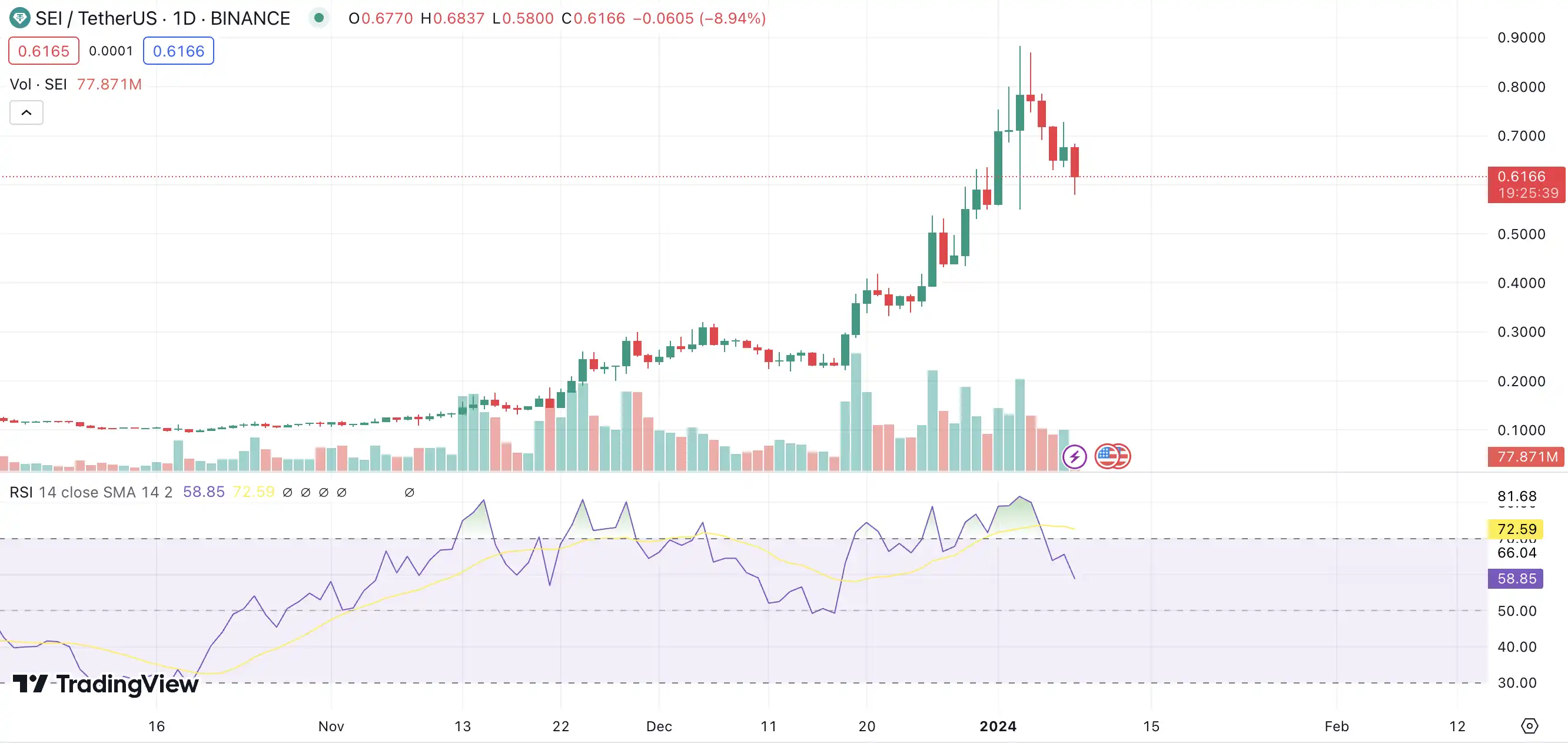 SEI 作为公链后起之秀,在 2023 年年末获得了上线以来最大的一波涨幅,也推动市场重新关注并行 EVM 这个叙事。截至撰稿时,SEI 的价格为 0.61 美元,24 小时跌幅为 8.14%。