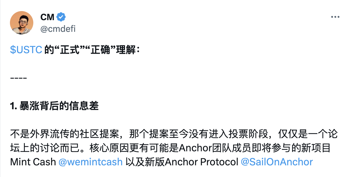 DeFi 研究员@cmdefi也认为 USTC 的价格暴涨与 Terra Classic 论坛的重新锚定提案无关,更有可能是由于 Anchor 团队成员即将参与的新项目 Mint Cash 以及新版 Anchor Protocol。
