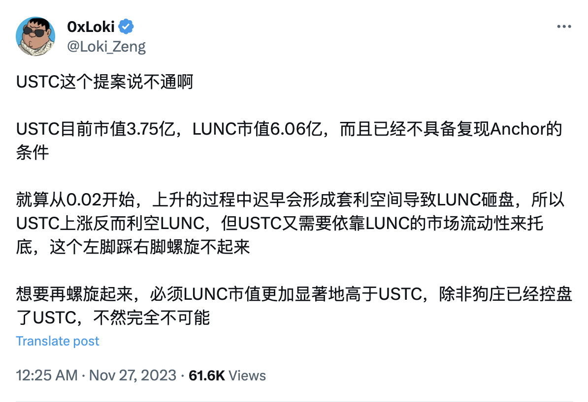 火币孵化器研究员 0xLoki 认为该提案所说 USTC 价格稳定在 0.02 美元,逐步上升的过程中会形成套利空间,导致 LUNC 砸盘。「所以 USTC 上涨反而利空 LUNC,但 USTC 又需要依靠 LUNC 的市场流动性来托底,这个左脚踩右脚螺旋不起来。」