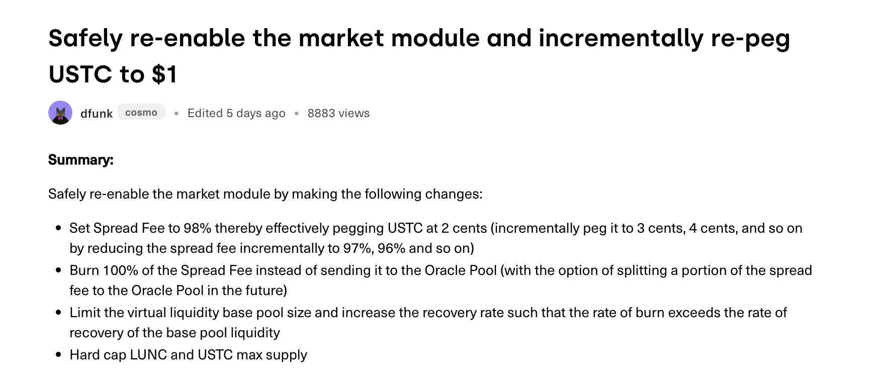 回到 Terra Classic 治理论坛的那篇提案中来,提案内容主要是通过重新启用市场模块逐步恢复 LUNC 与 USTC 的锚定中来。目前该提案并没有正式开启投票,仍在讨论阶段。