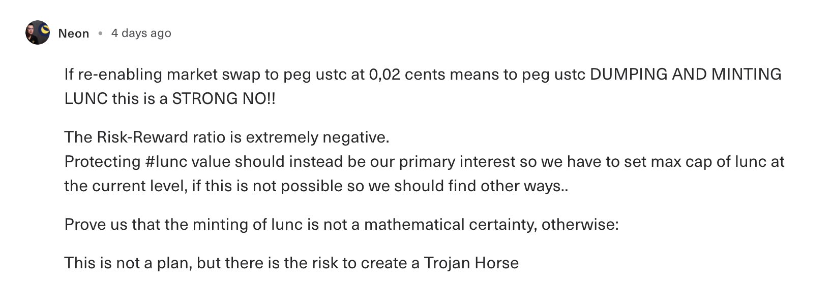 但在提案评论区大部分人并不赞成这样的做法,Terra Classic 治理人员 Neon 称这个提案的风险回报不成正比甚至为负,不是一个计划,而是在创建特洛伊木马。他称「保护 LUNC 价值应该是我们的首要兴趣,因此我们必须将 LUNC 的最大供应上限设定为当前水平,如果这不可行,那么我们应该寻找其他方式。」