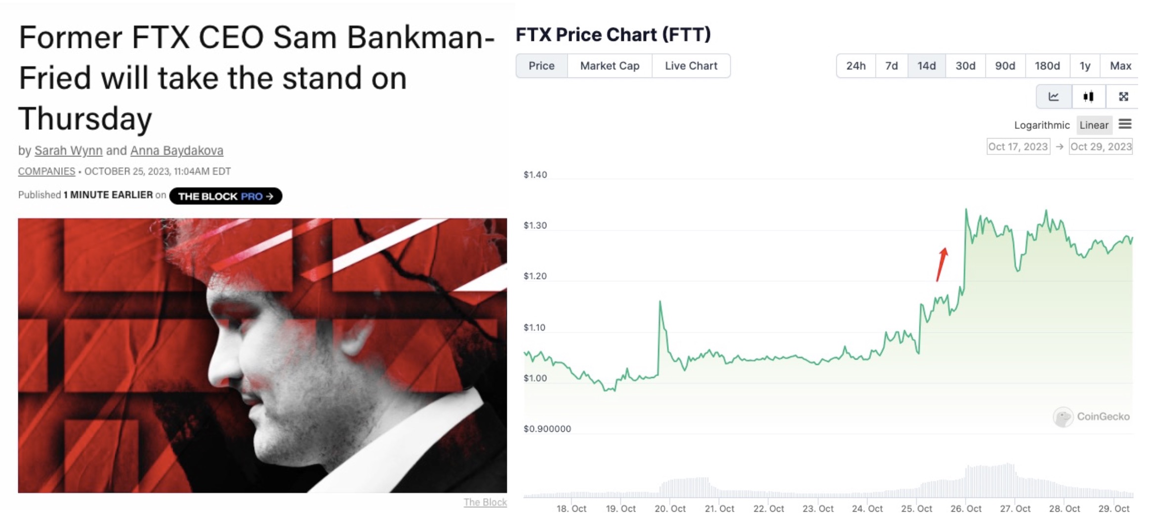 10 月 25 日,FTT 又出现短时达 23.8% 的涨幅,而这来自于 SBF 的律师证实SBF 将于 10 月 26 日出庭作证的消息。