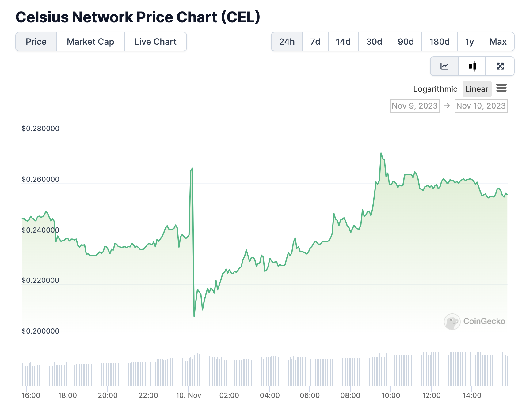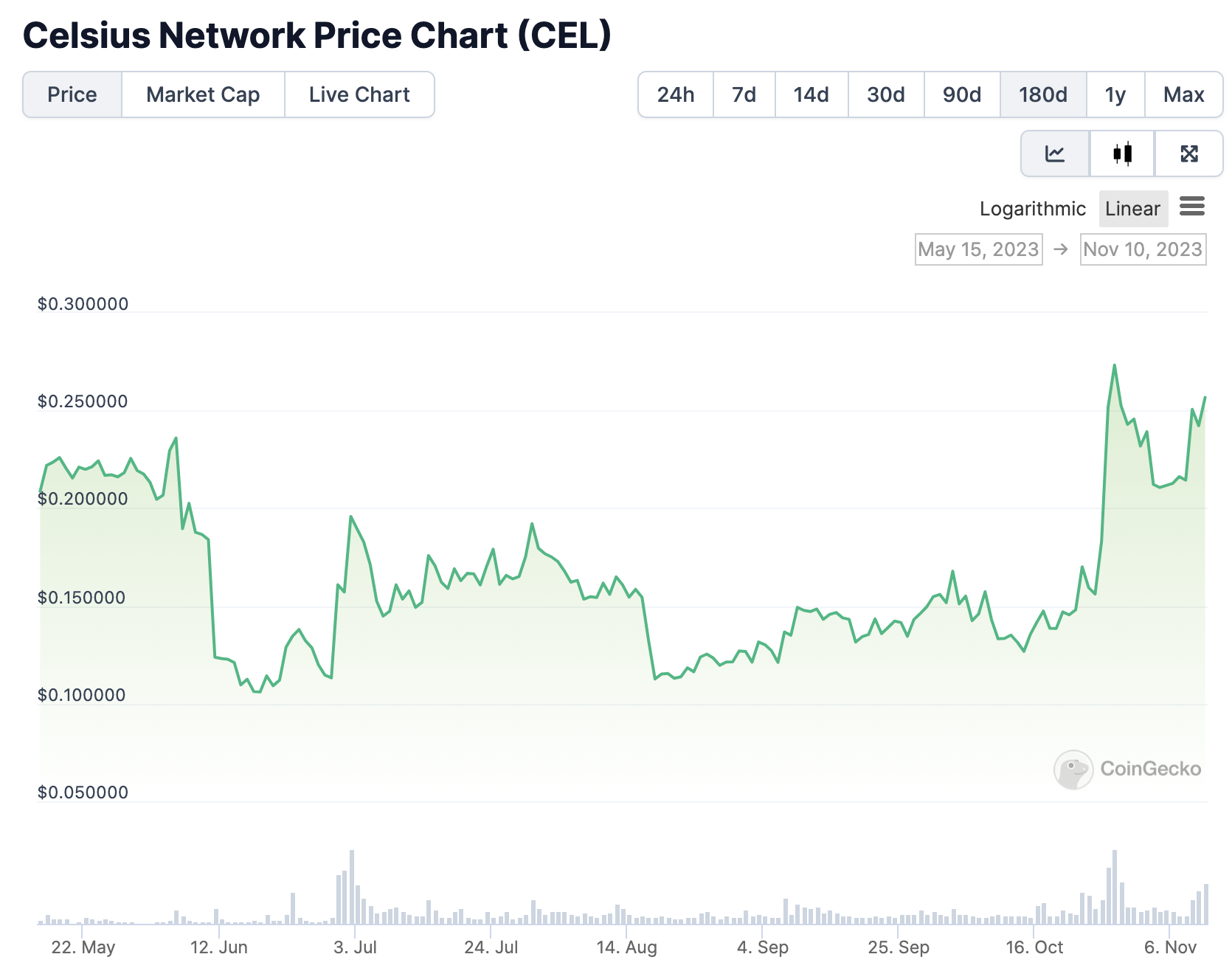 如果以半年的尺度观察 CEL 的价格可以发现,近半年来,CEL 价格曾在 10 月 28 日达到最高点。而彼时 SBF 在出庭作证时,曾提到 Celsius 曾希望 SBF 为其提供紧急资金,但 SBF 拒绝了这一请求。