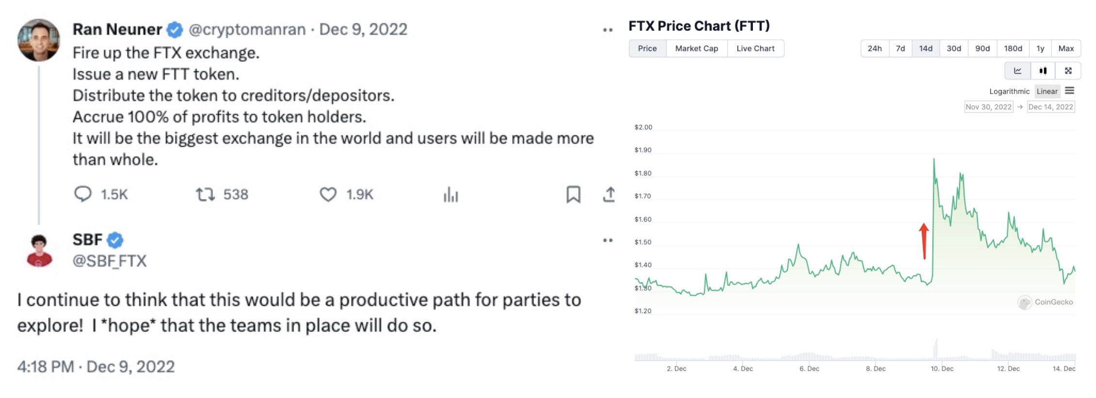 值得注意的是,FTT 近一年以来出现多次上涨趋势。2022 年 12 月 9 日,CNBC 加密评论员 Ran Neuner 在其社交平台提议重启 FTX 并重新发行新 FTT。SBF 回应称,这将是各方探索的富有成效的途径。希望现有的团队会这样做。随后,这则推送引起了 FTT 超 20% 的涨幅。