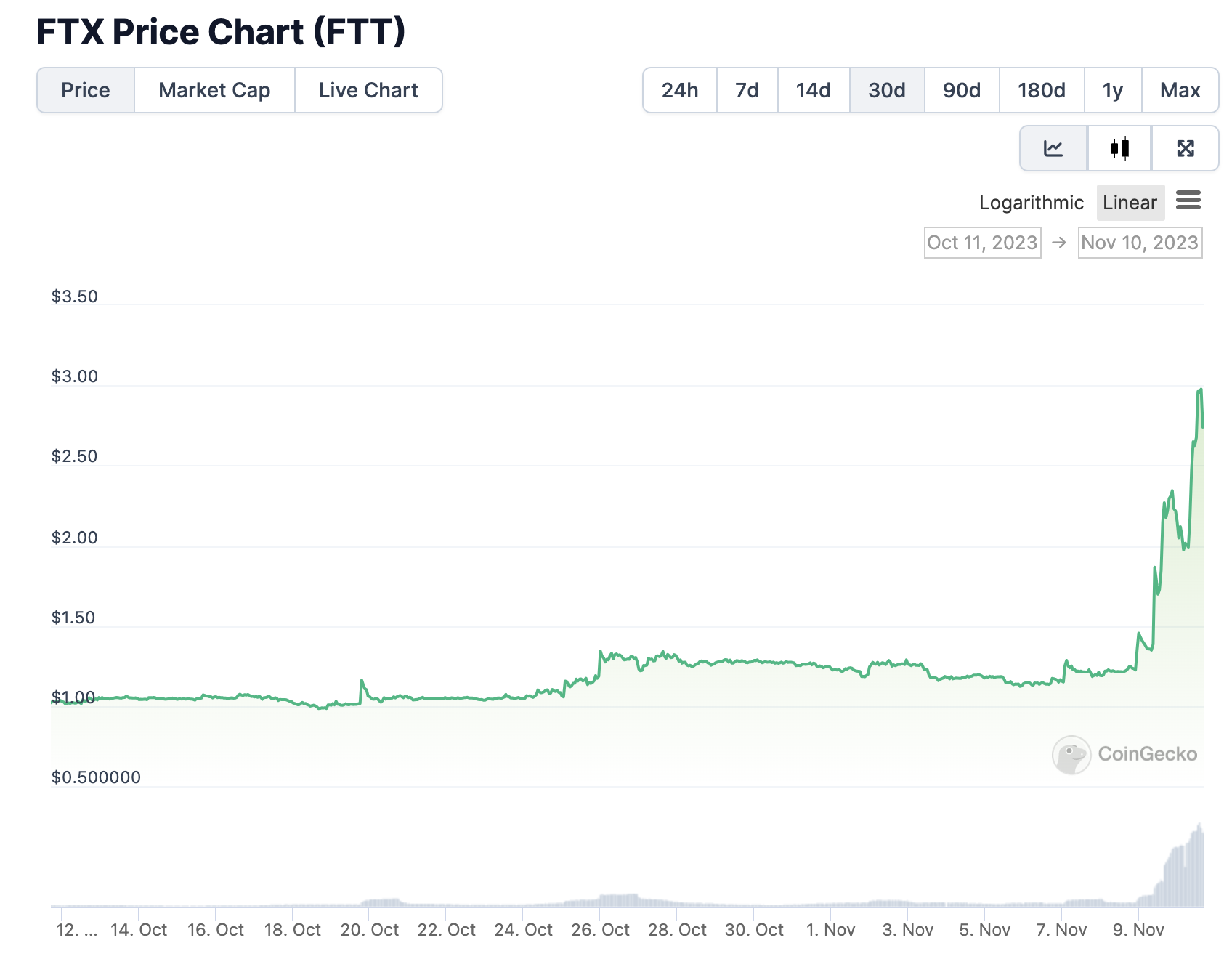 随后,FTX 代币 FTT 拉升触及 2.36 美元后回落,24 小时涨幅达 83.86%,30 天涨幅更是高达 169.6%,截止发稿时 FTT 报价达到 2.82 美元。