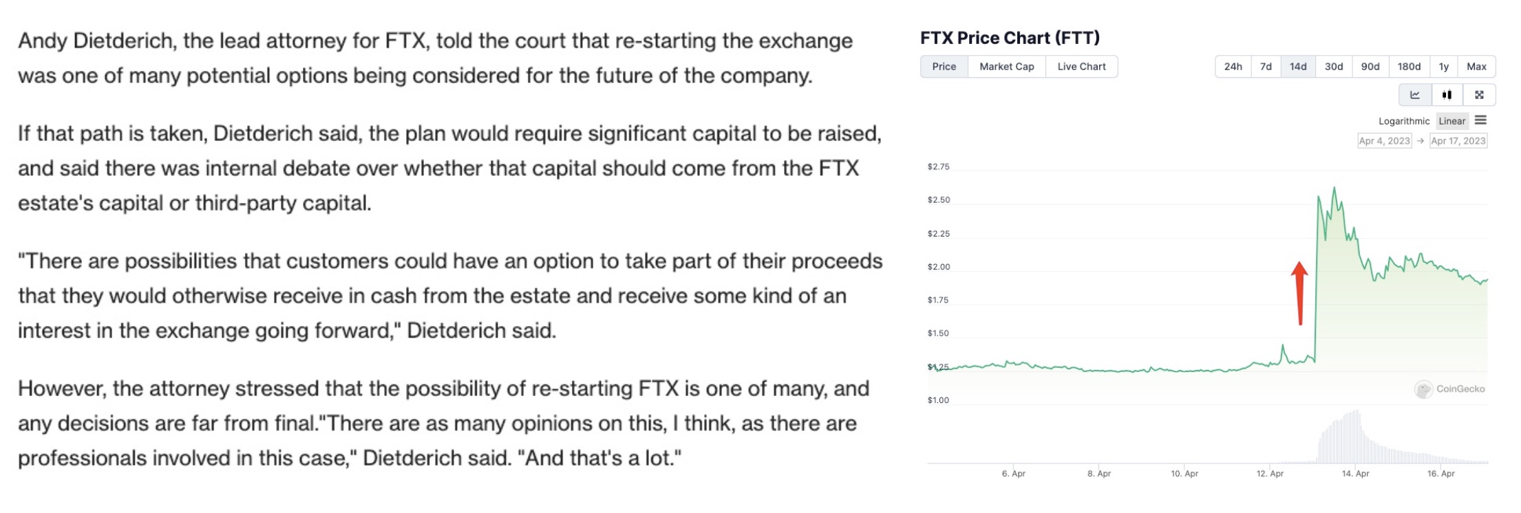 2023 年 4 月,FTX 破产案律师法庭听证会上表示,FTX 正考虑在未来某个时候重新开启交易平台业务。受此消息影响,FTT 短时突破 2.7 美元,24 小时涨幅 97.5%。
