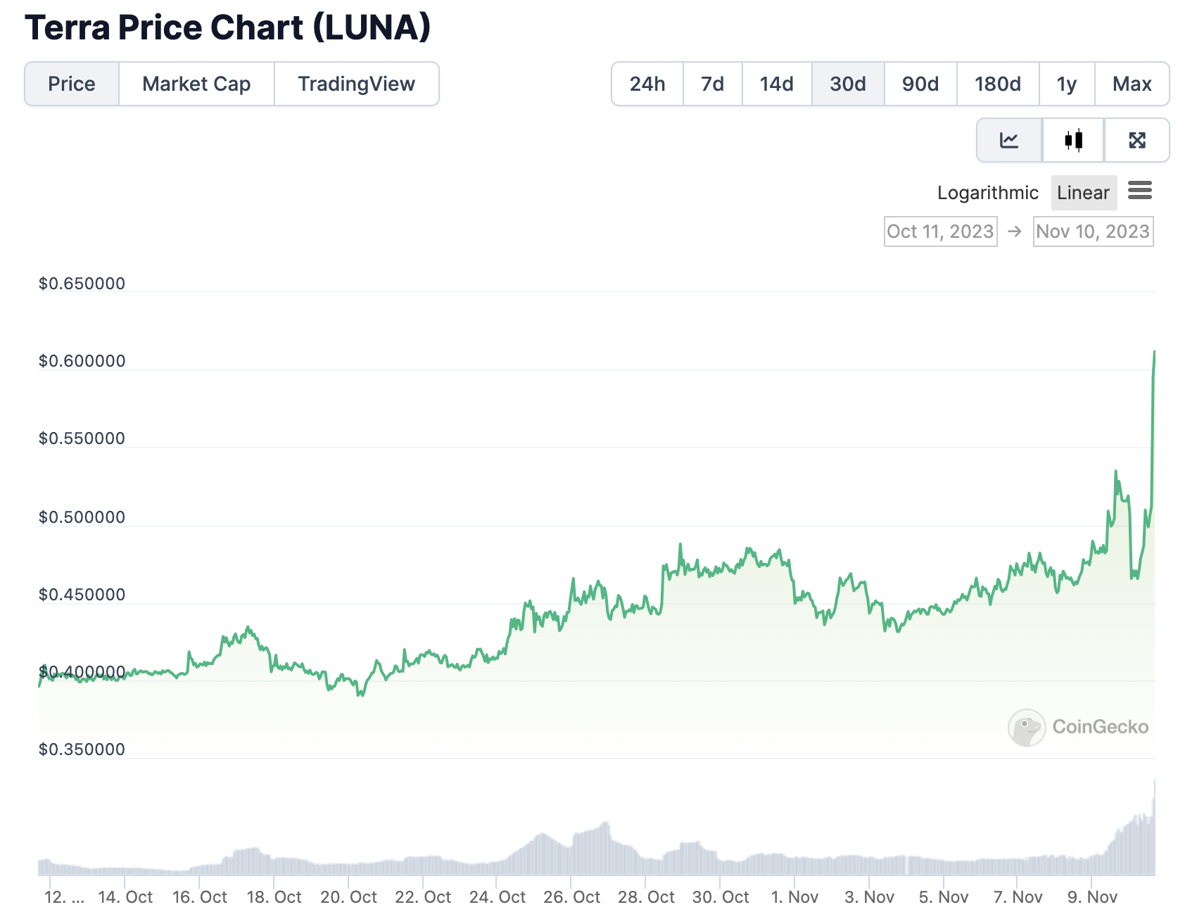 与 CEL 一样在近期有着较大涨幅的,还有曾一度风靡韩国甚至全世界的 LUNA。据 CoinGecko 数据显示,LUNA 24 小时涨幅达 13.7%,30 天涨幅为 56.6%,截止发稿时 LUNA 报价 0.594 美元,为近三个月来最高。而就在 11 月 3 日,SEC 曾请求法院对 Do Kwon(LUNA 发行方 Terra 的创始人)和 Terraform 作出简易判决。