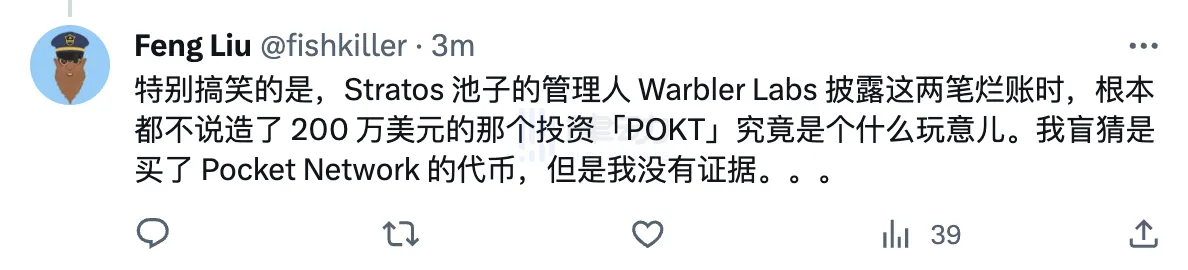 如今 Goldfinch 平台上在一个月内接连出现两起涉及资金风险的事件,也让社区用户对其安全性表示质疑。BODL Ventures 合伙人@fishkiller 在社交媒体 X(原推特)上发文指出,Stratos 池子连续投了两个项目,全部颗粒无收,并质疑或许 Goldfinch 的暴雷背后,存在更多暗箱操作。