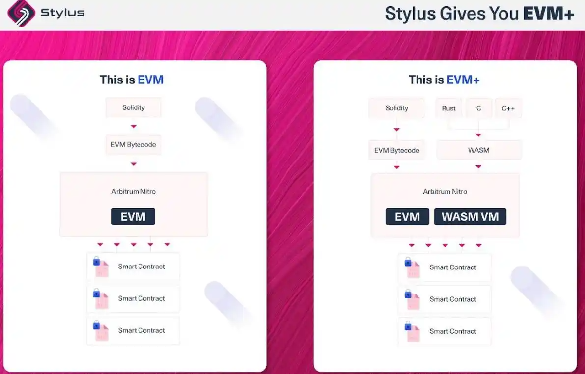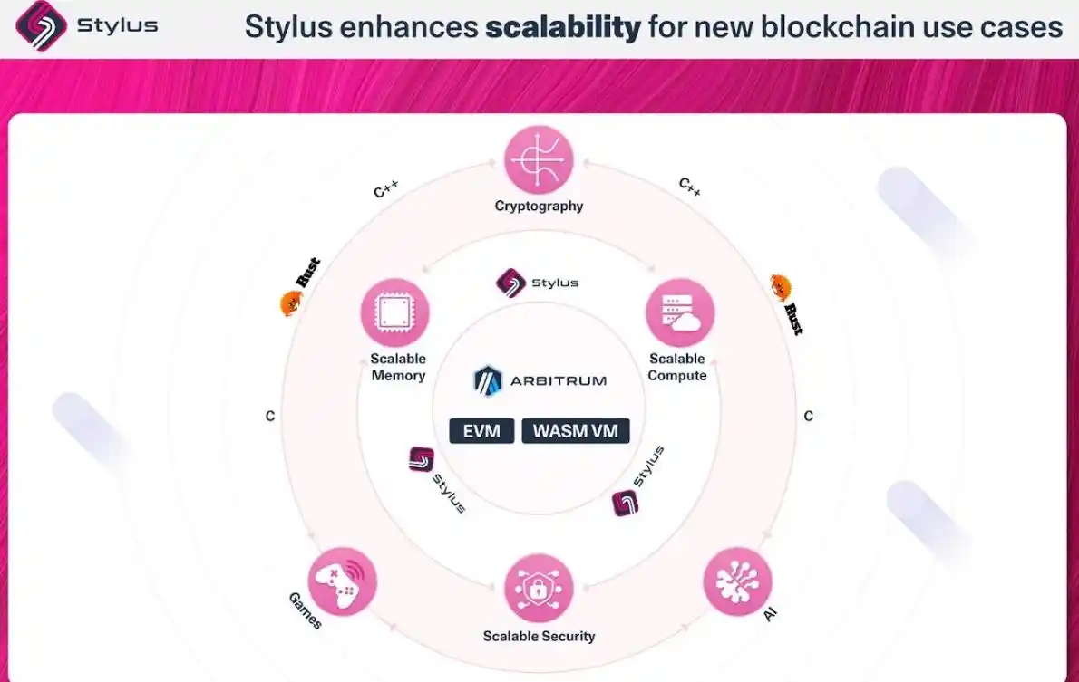 Stylus 是 Arbitrum 开发的支持多语言构建应用程序的开源 SDK。这是一种实现 EVM+ 兼容性的产品。简言之,开发人员在 Arbitrum 上既能使用传统 Solidity 语言,又能使用 WASM 兼容的语言,如 Rust、C 和 C++等来构建应用程序。此外,Stylus 使 Dapps 的执行更加高效,显著地降低了 gas 成本。