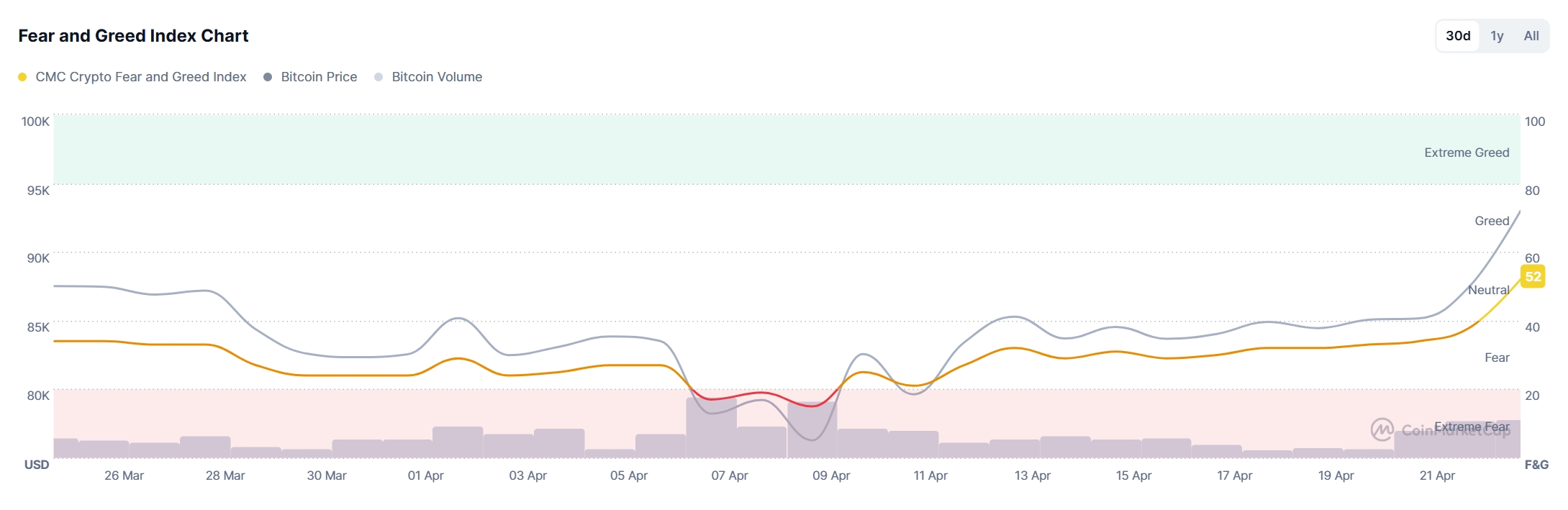 萌币网 消息,据 CoinMarketCap 数据显示,今日贪婪指数为 52,市场情绪已回归中性。