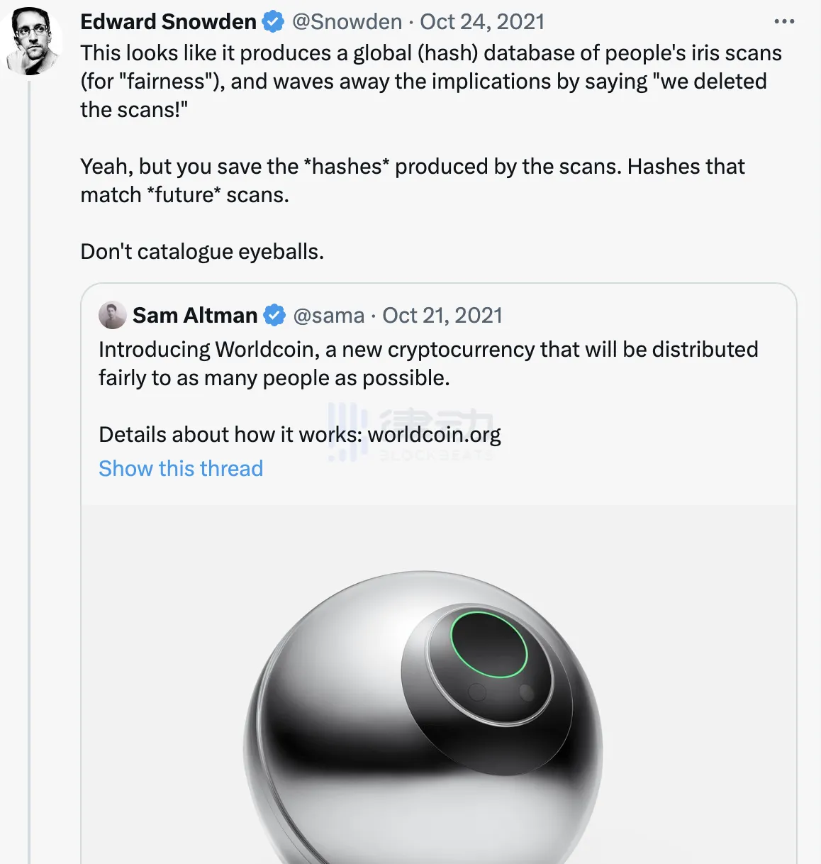 而早在 2021 年 10 月,斯诺登就曾对 Worldcoin 的 ID 计划提出了质疑,担心 Worldcoin 构建全球化瞳孔数据库。