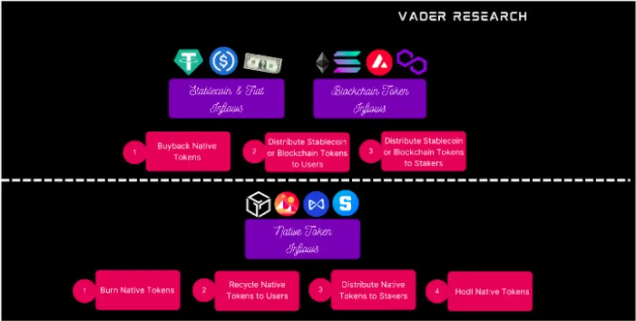 每当资产流入生态系统,就会产生价值,而开发者/DAO 的任务就是确定可交易资产的价值累积比例。Token 价值累积机制的选取将取决于流入资金属于原生 Token 还是其他货币。此外,价值累积的时机同样非常重要。