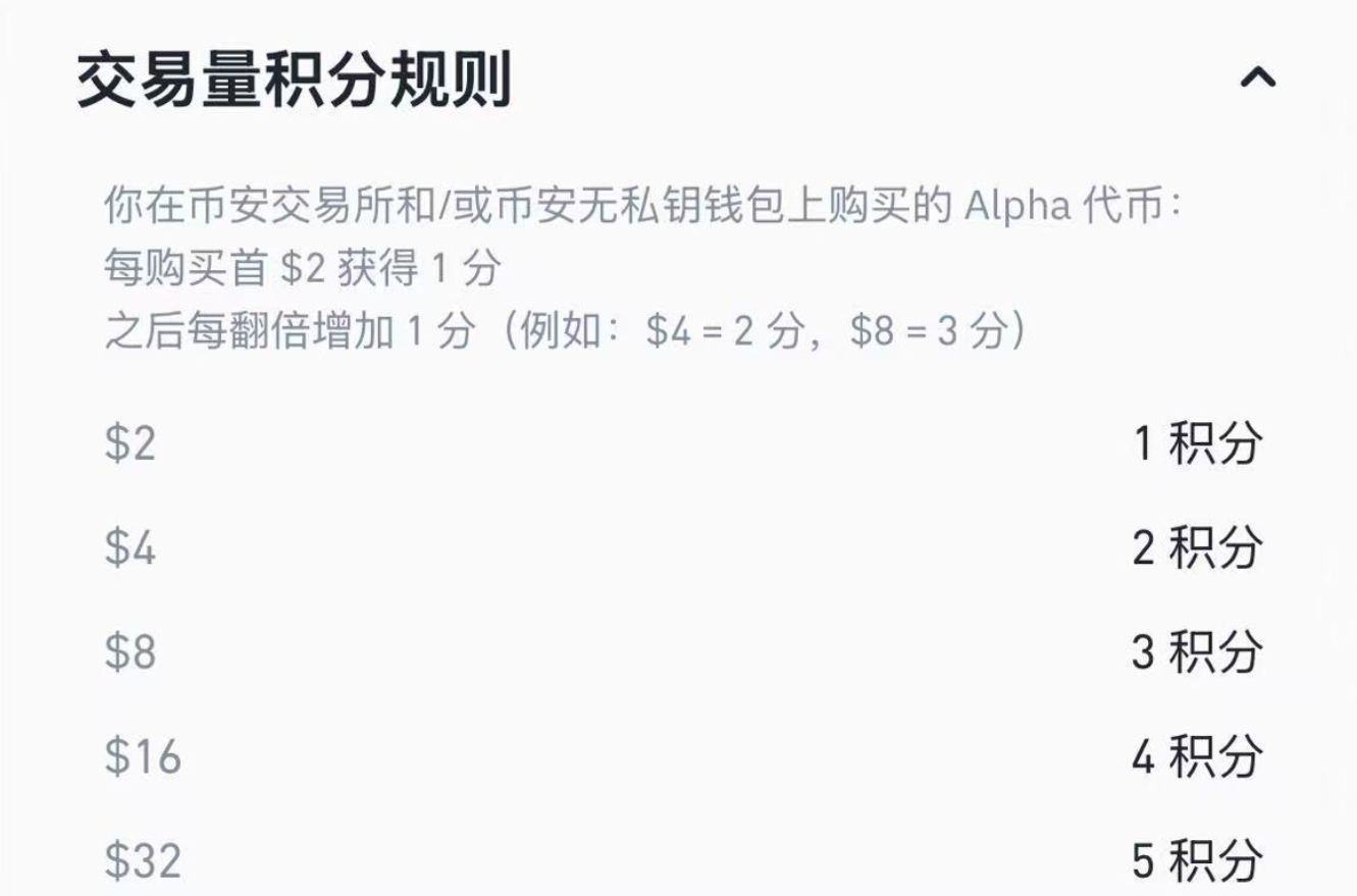 萌币网 消息,币安上线 Alpha Points 系统。该系统用于评估用户在币安 Alpha 及钱包生态系统中的活跃度,未来将决定是否具备参与 TGE 及 Alpha 代币空投的资格。积分按过去 15 天内的代币资产余额和 Alpha 代币购买量每日累计计算,当前出售 Alpha 代币不会产生积分。