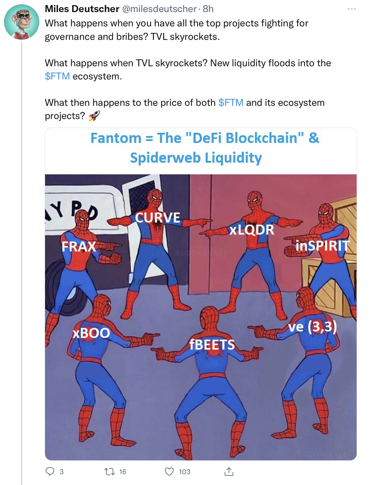 正如 Miles Deutscher 所说,当一个公链生态里的所有顶级项目都开始争夺治理权时,TVL 就会飙升。而新的项目则会被此吸引,并进一步为生态带来更多的流动性。无疑,ve(3,3) 制定的 Token 分配策略将为 FTM 和 KP3R 带来更高的关注度,Fatom 生态未来的表现也十分值得关注。