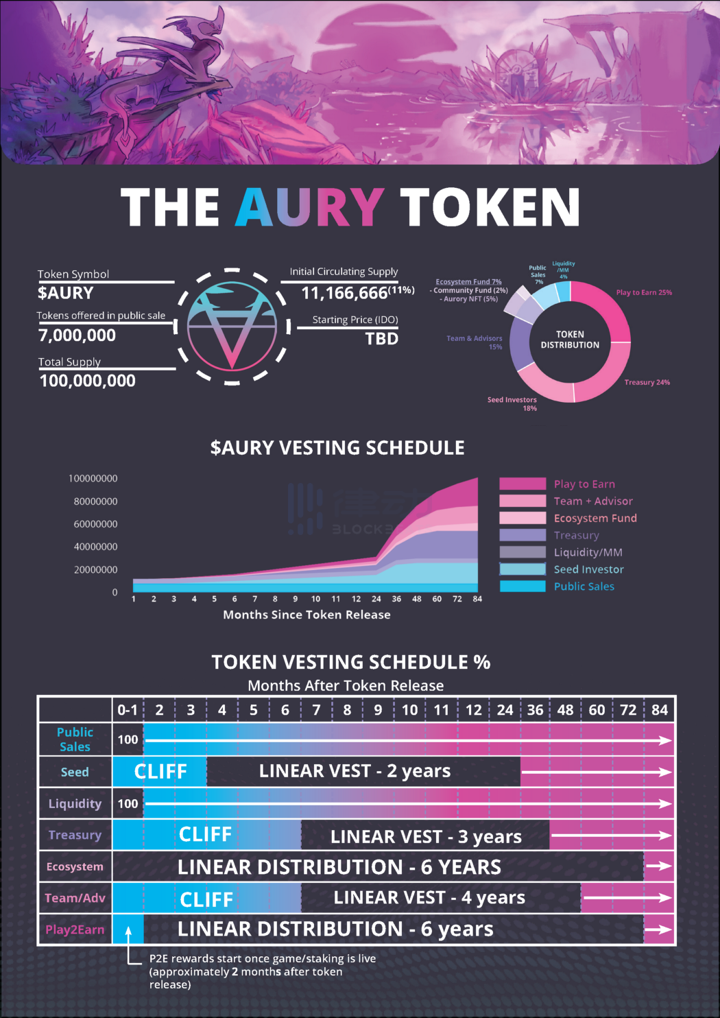 Aurory 使用 AURY 作为治理 token,AURY 总量 1 亿枚。具体 Token 分配、Token 发行时间表以及锁仓 Token 释放时间线如下图所示。