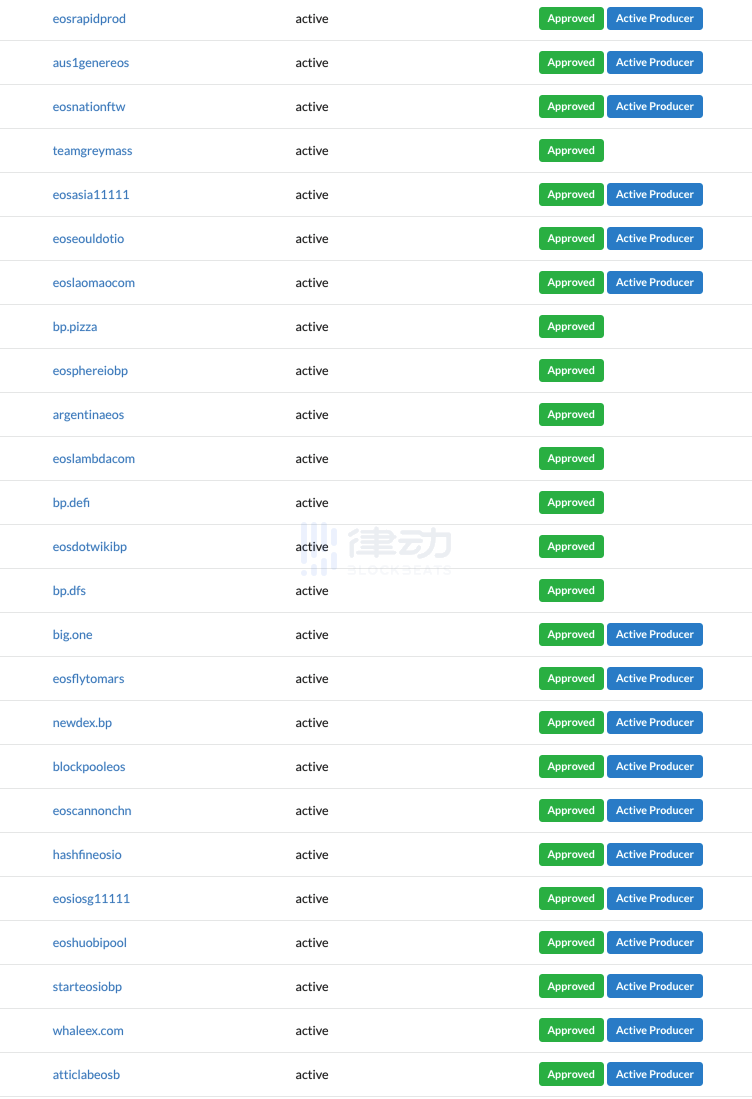 在提案发起当天,有 7 个主节点同意提案,随后的 5 天内,又新增了 6 个主节点和 5 个备用节点同意提案。而按照 EOS 的网络规则,当有 15 个主节点同意提案时,该提案就会被执行。