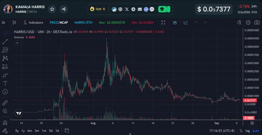 副总统卡玛拉·哈里斯相关的Meme代币Kamala Harris Token(KAMA)表现也突出。KAMA于2023年8月推出,其名称源自哈里斯副总统的名字,但实际上与她本人没有直接关联。