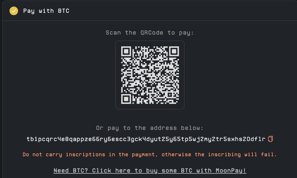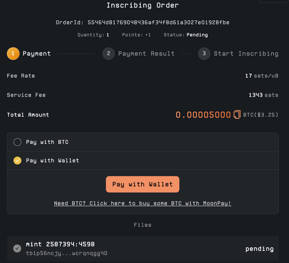 随后就是付款,使用 Pay with BTC 或者 Pay with Wallet。前者就是扫码或者复制用其他钱包进行付款,后者就是使用连接Unisat的网站的钱包进行付款,随后就是签名支付即可,等待区块确认就好,铸造完成后就可以在钱包中看到了。